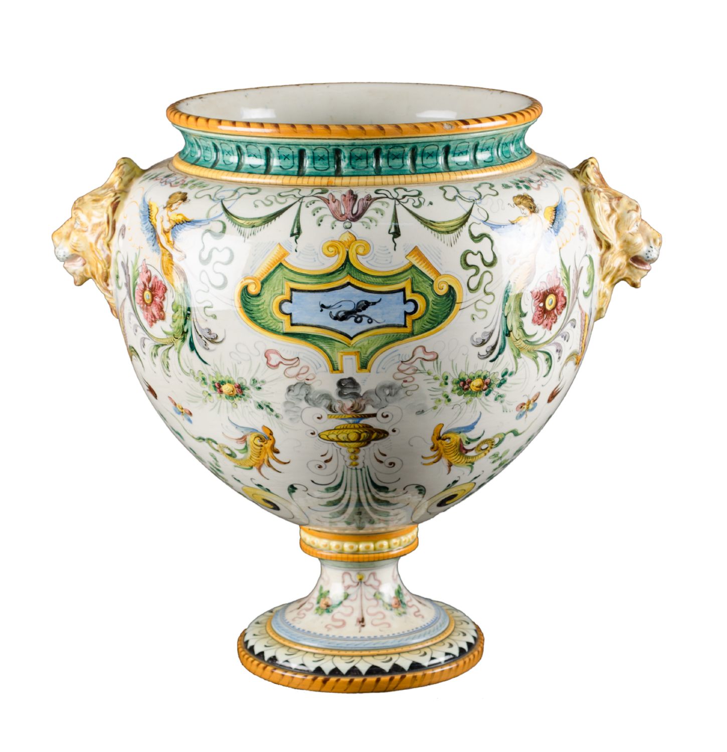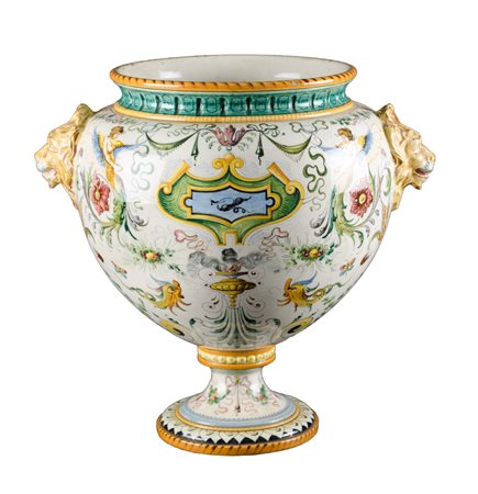 VASO in ceramica smaltata e decorata con manici a guisa di teste leonine. Italia XX secolo Misure: h cm 120