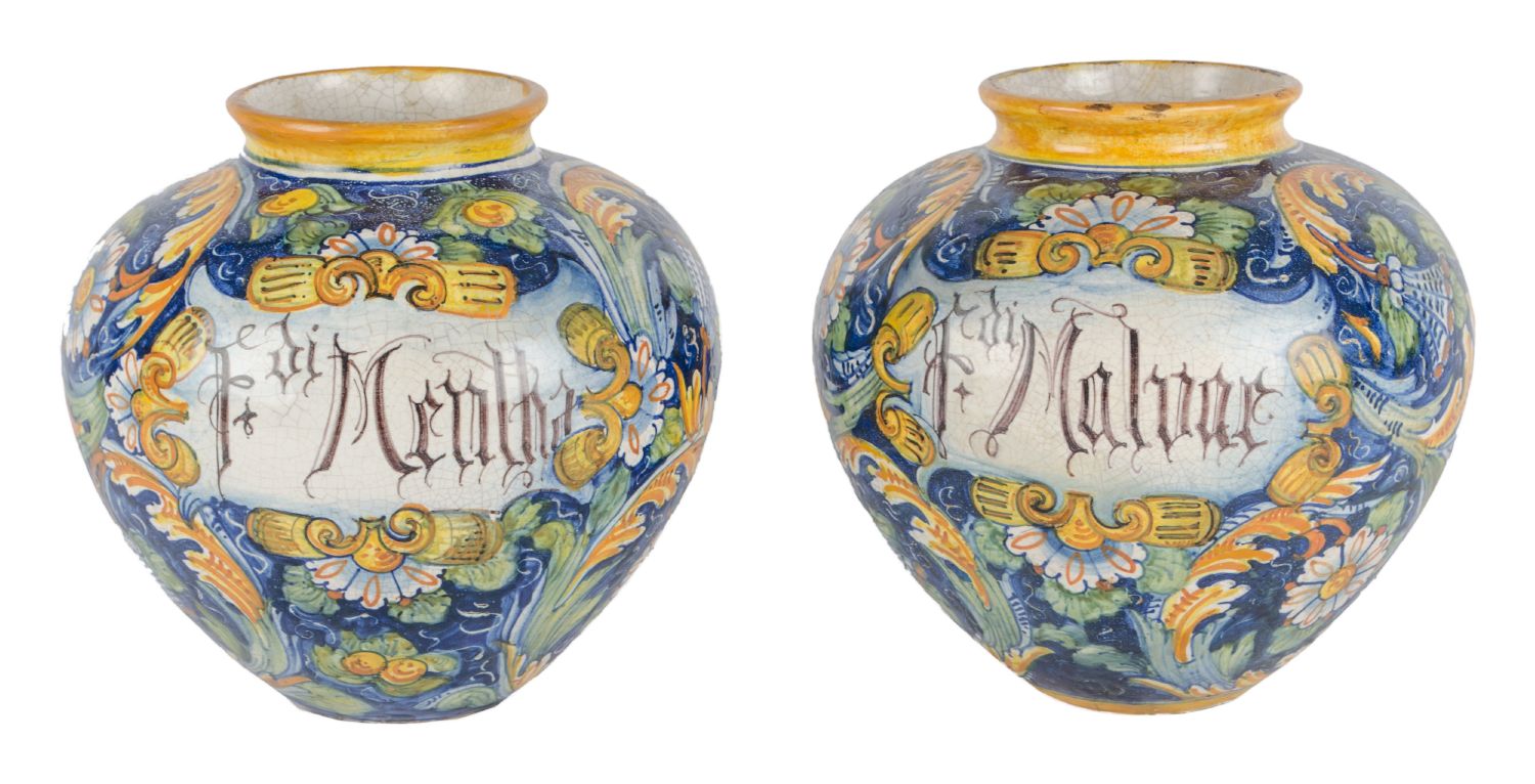 COPPIA BOCCE in ceramica smaltata e decorata a motivo floreale e fogliaceo (restauri). Venezia XX secolo Misure: h cm 25