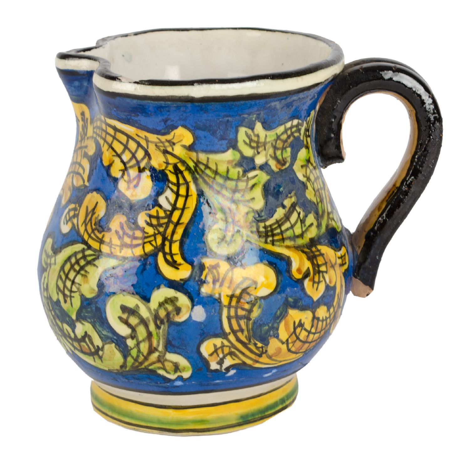 BROCCA in ceramica smaltata e decorata, firmato Bonaccorso (sbeccature). XX secolo Misure: h cm 16