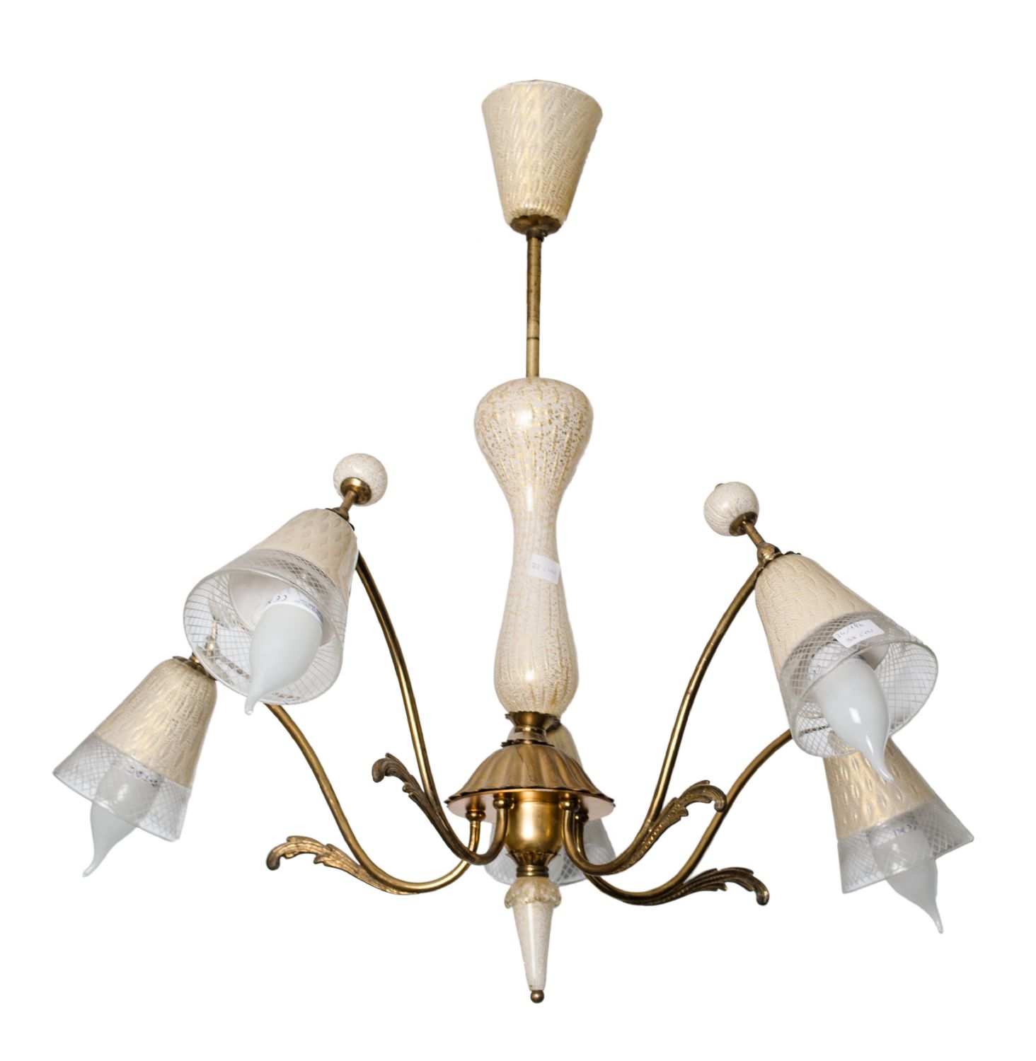 LAMPADARIO in vetro di Murano nei toni del bianco e oro a cinque luci. XX...