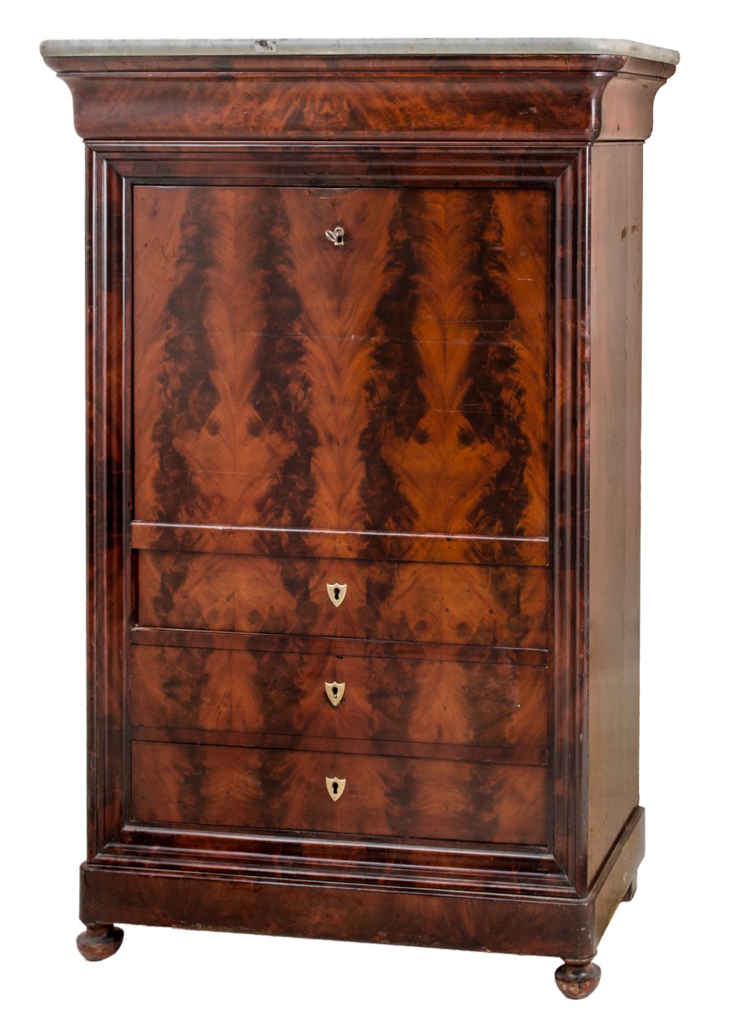SECRETAIRE Luigi Filippo in piuma di mogano con tre cassetti sottostanti, cassetto sovrastante e piano in marmo bianco di Carrara. Francia meta' '800 Misure: cm 50 x 72 x h 130
