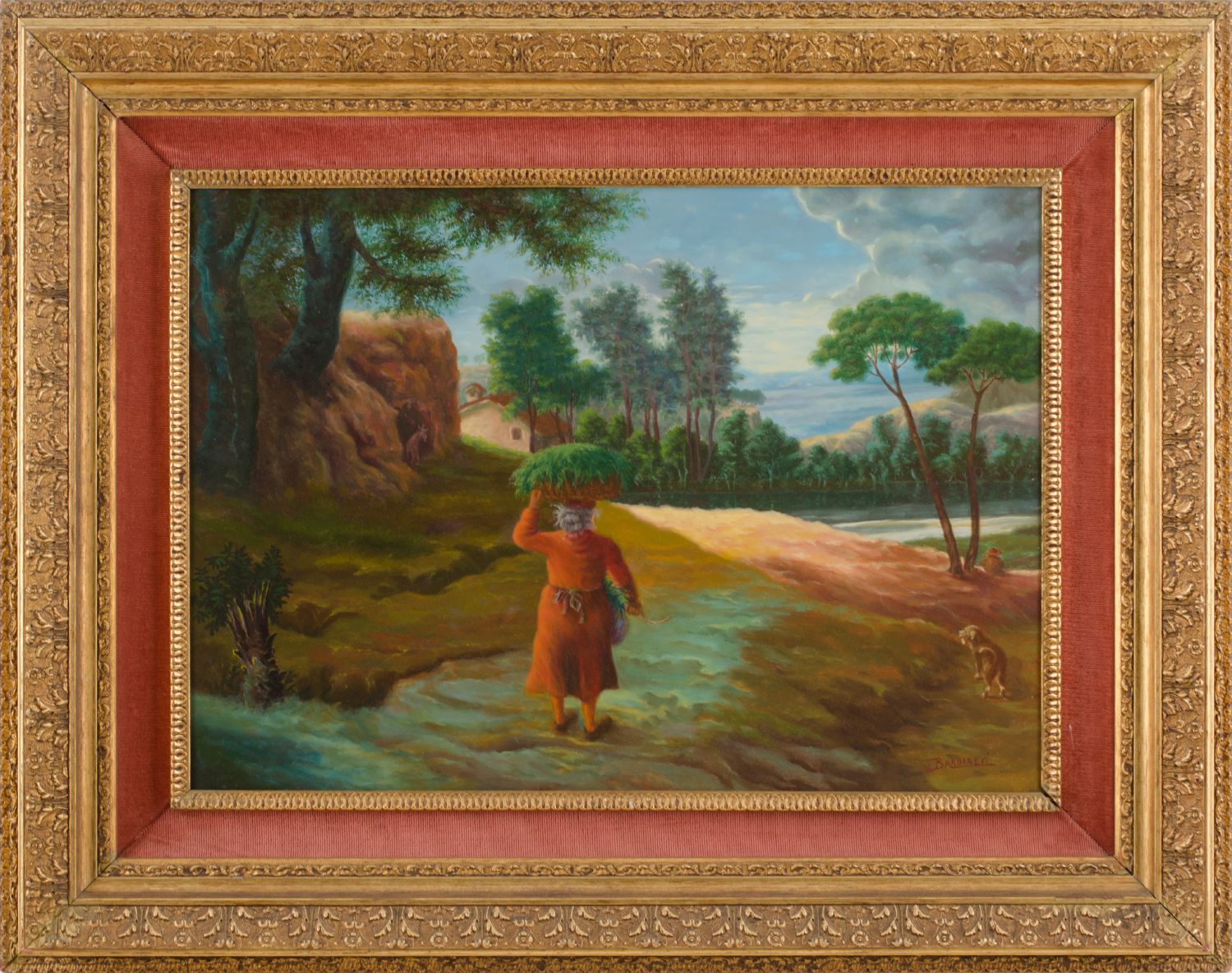 I. BARBARIESI OLIO su faesite "paesaggio con contadina" firmato in basso a...