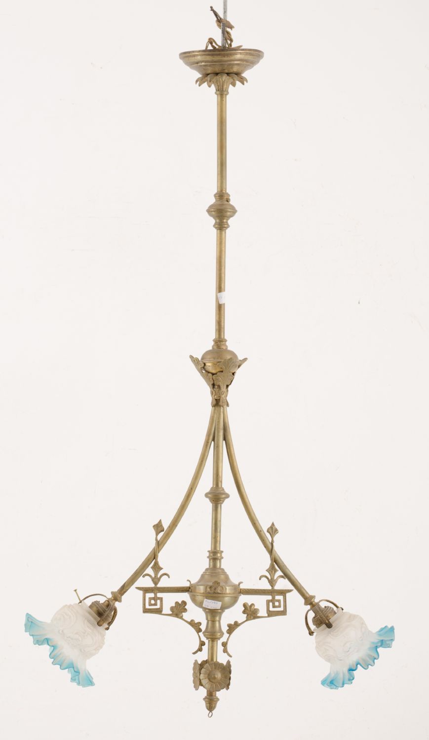 LAMPADARIO Liberty a tre luci in bronzo con bocce. Primi '900 Misure: h cm 100