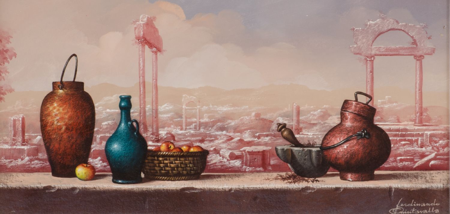 FERDINANDO QUINTAVALLA (Parma 1951) OLIO su tavola "natura morta", firmato in basso a destra. Misure: cm 20 x 40