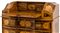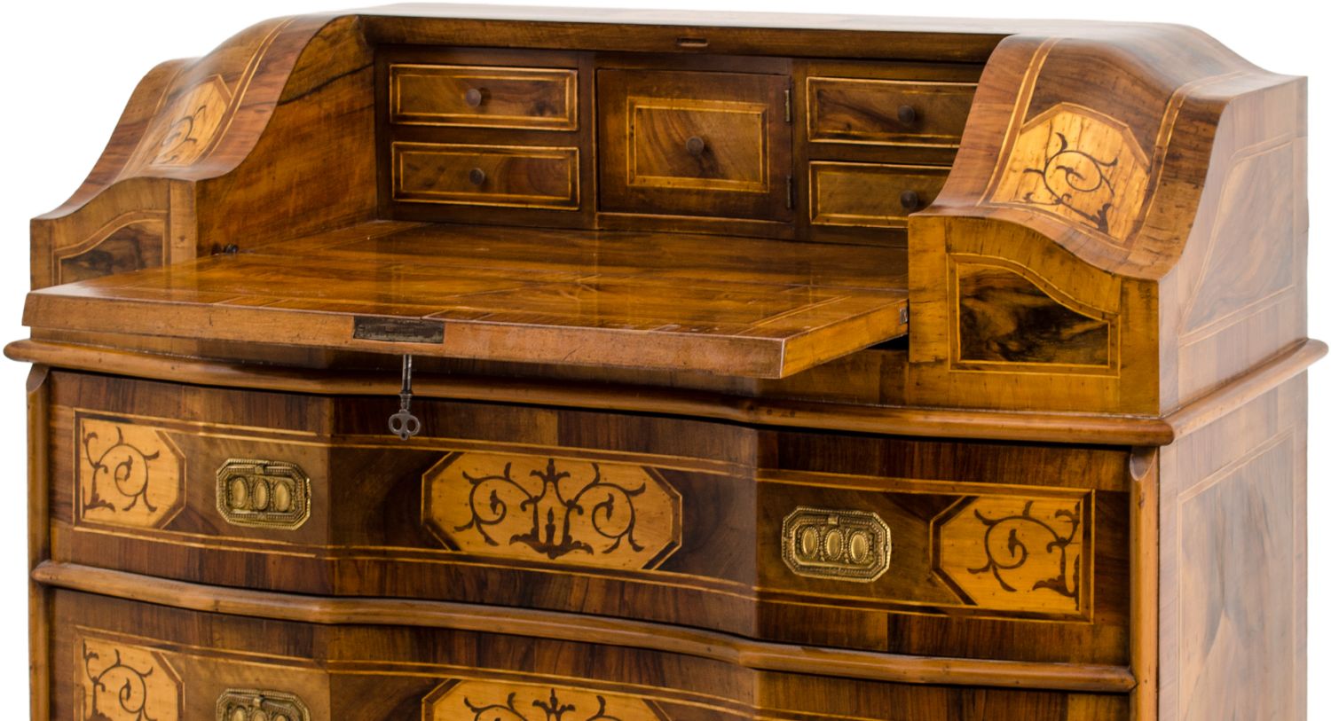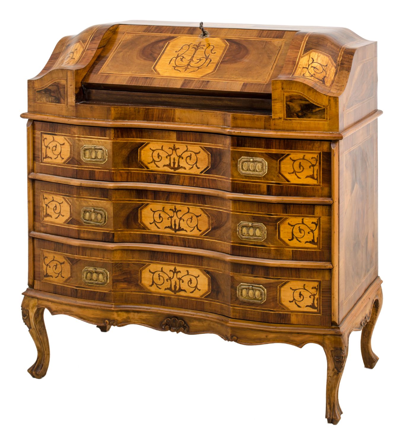PICCOLO BUREAU in noce, radica di noce e tarsie in bosso con ribalta e tre...