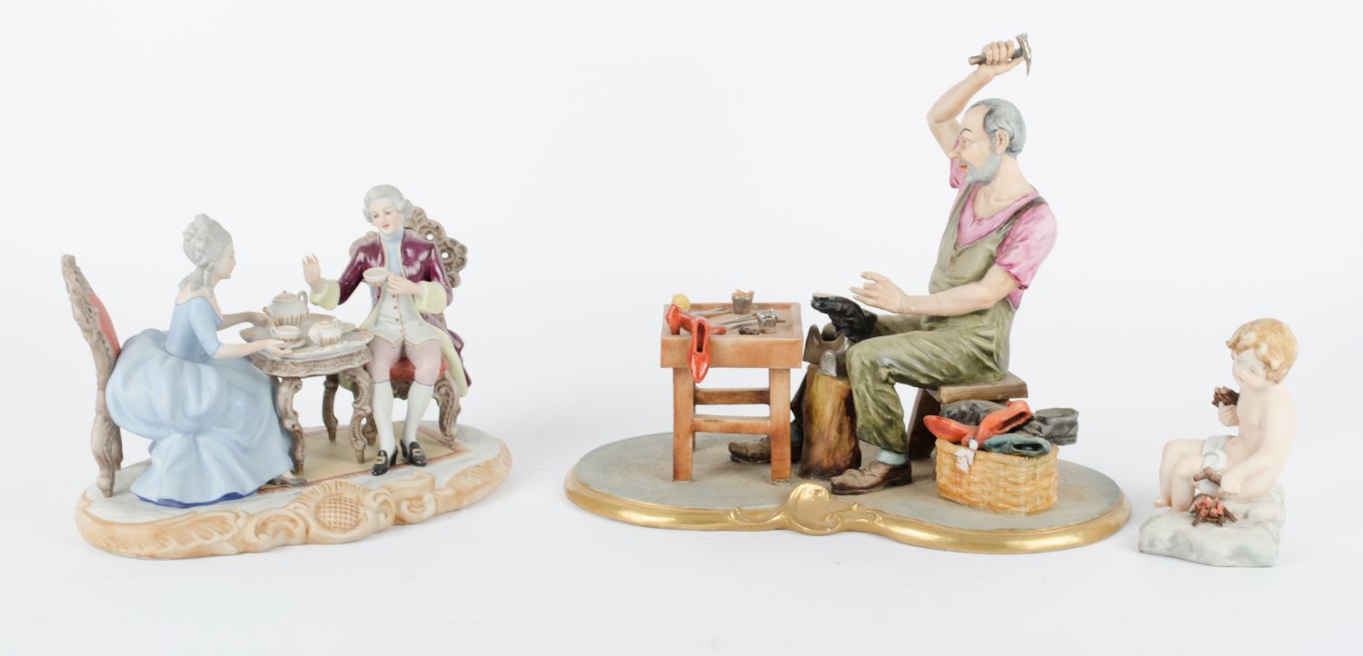 LOTTO composto da GRUPPO in porcellana raffigurante "ciabattino", GRUPPO in porcellana raffigurante "scena galante" e da SCULTURA in biscuit raffigurante "putto" (difetti). XX secolo Misure: varie