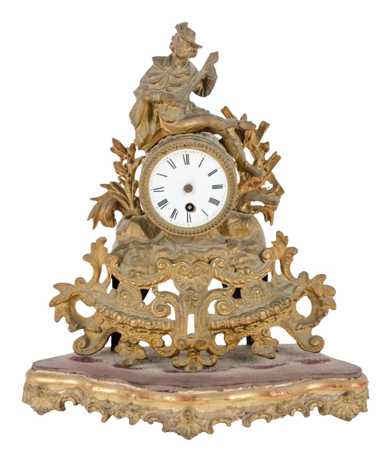 OROLOGIO da tavolo in metallo dorato con base in legno dorato. Francia XIX...