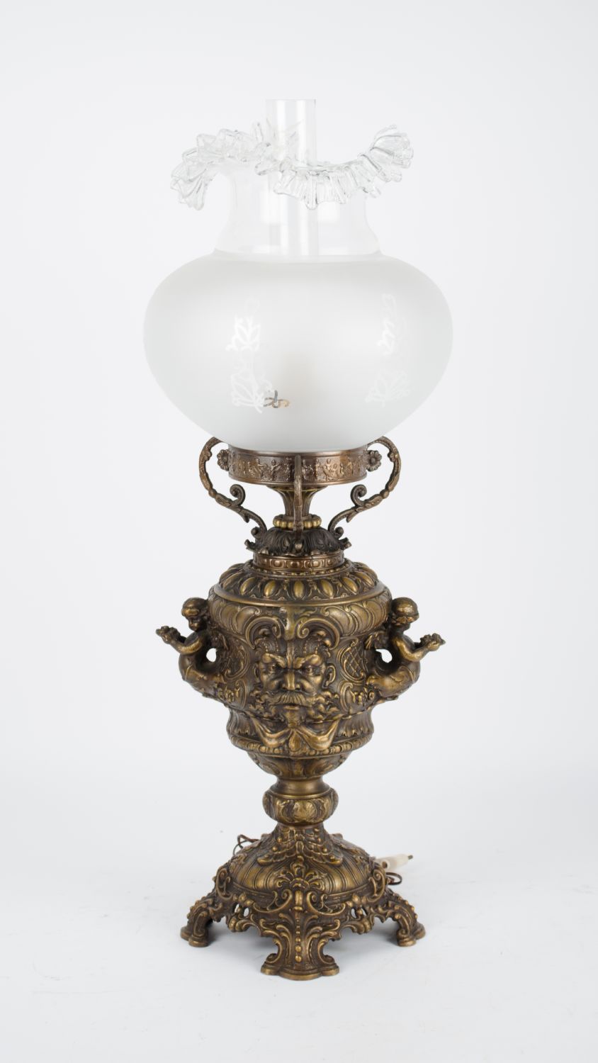 LUME in bronzo brunito riccamente lavorato, boccia in vetro. XX secolo Misure: h cm 70