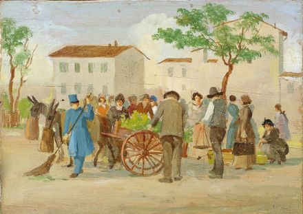 Anonimo del XX sec. MERCATO RIONALE Olio su tavola, cm. 7,7x11 Titolo sul verso.