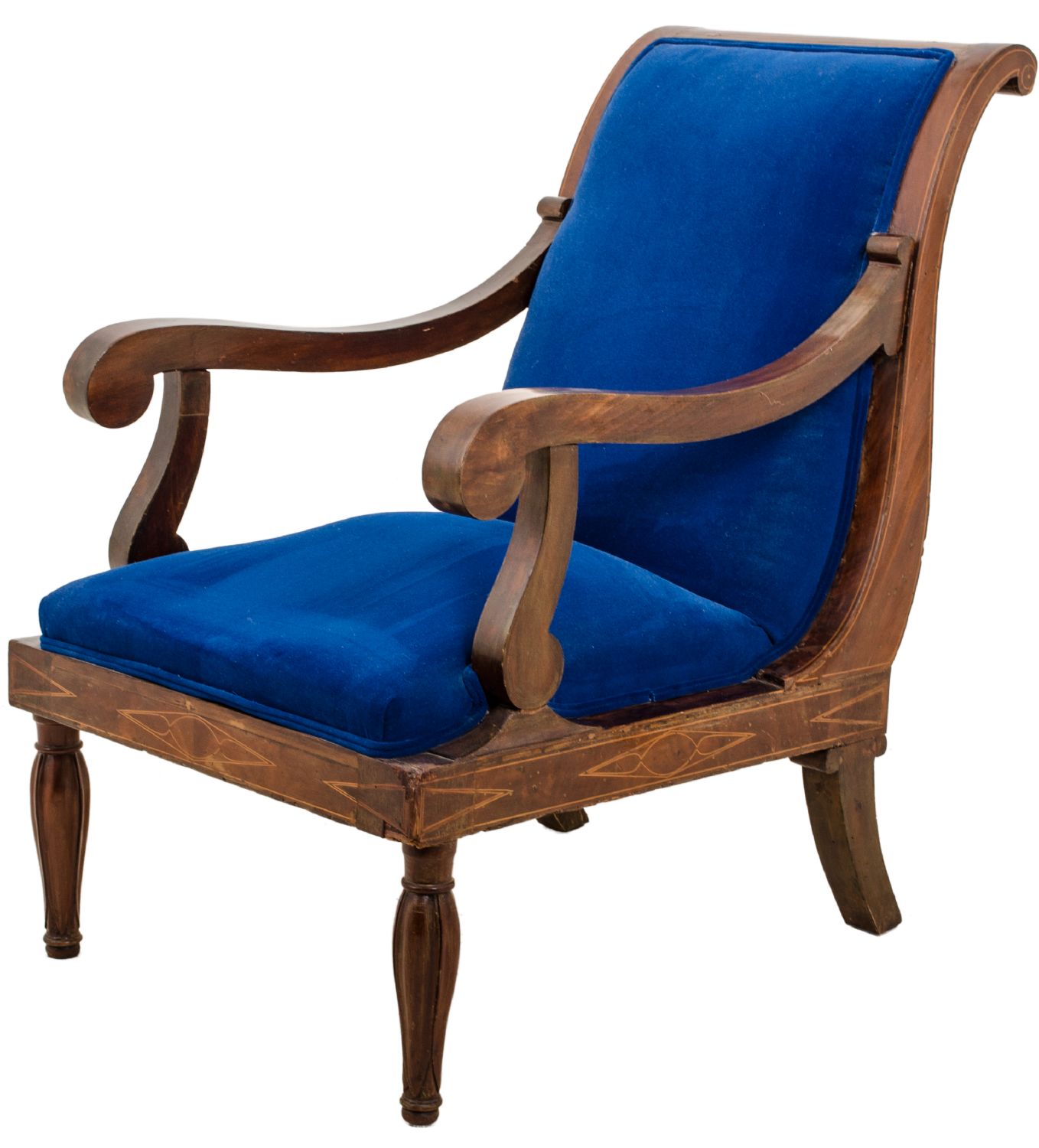 POLTRONA Carlo X in mogano e piuma di mogano con perfili in bosso. Sicilia primi '800 Misure: cm 86 x 60 x h 87