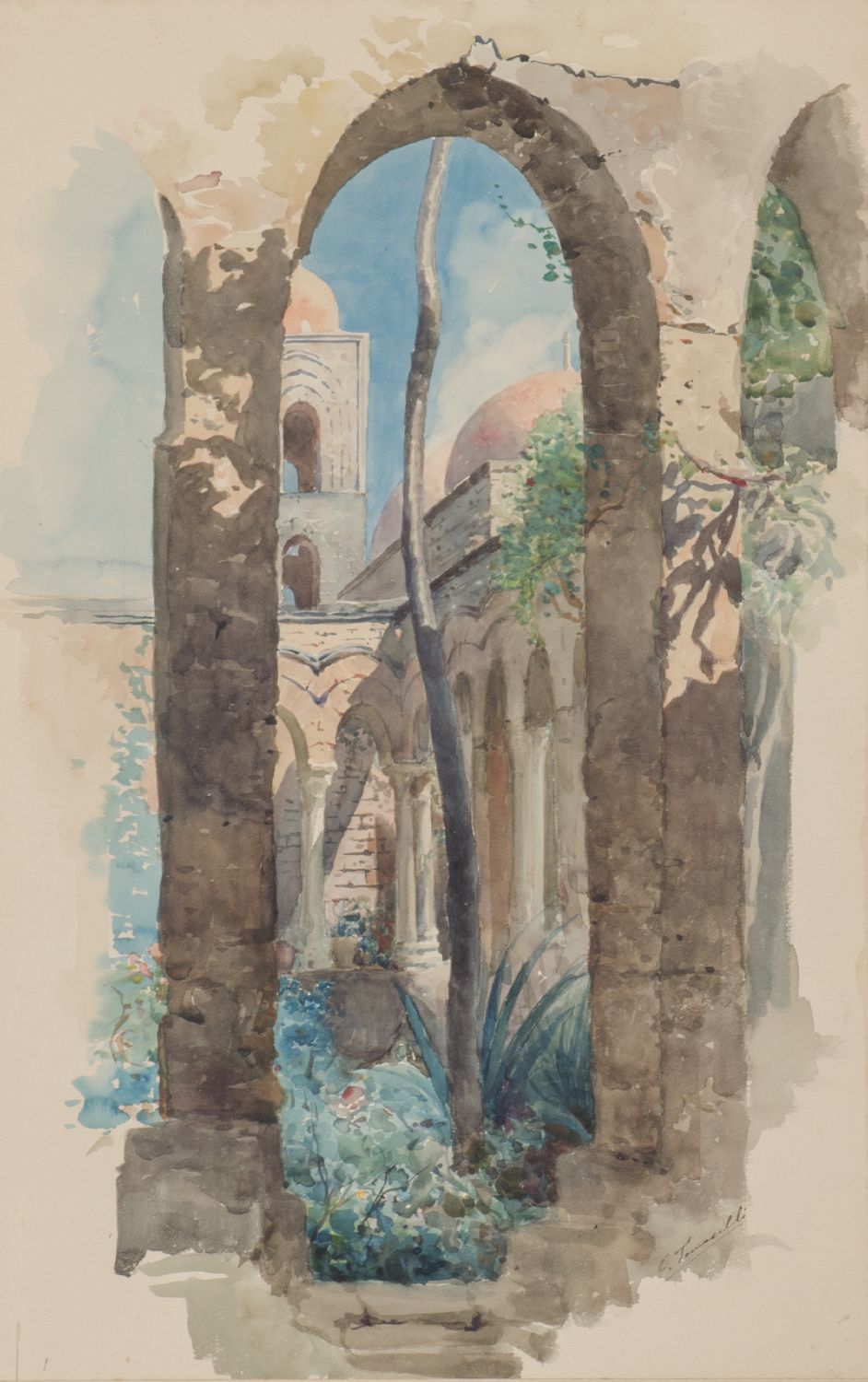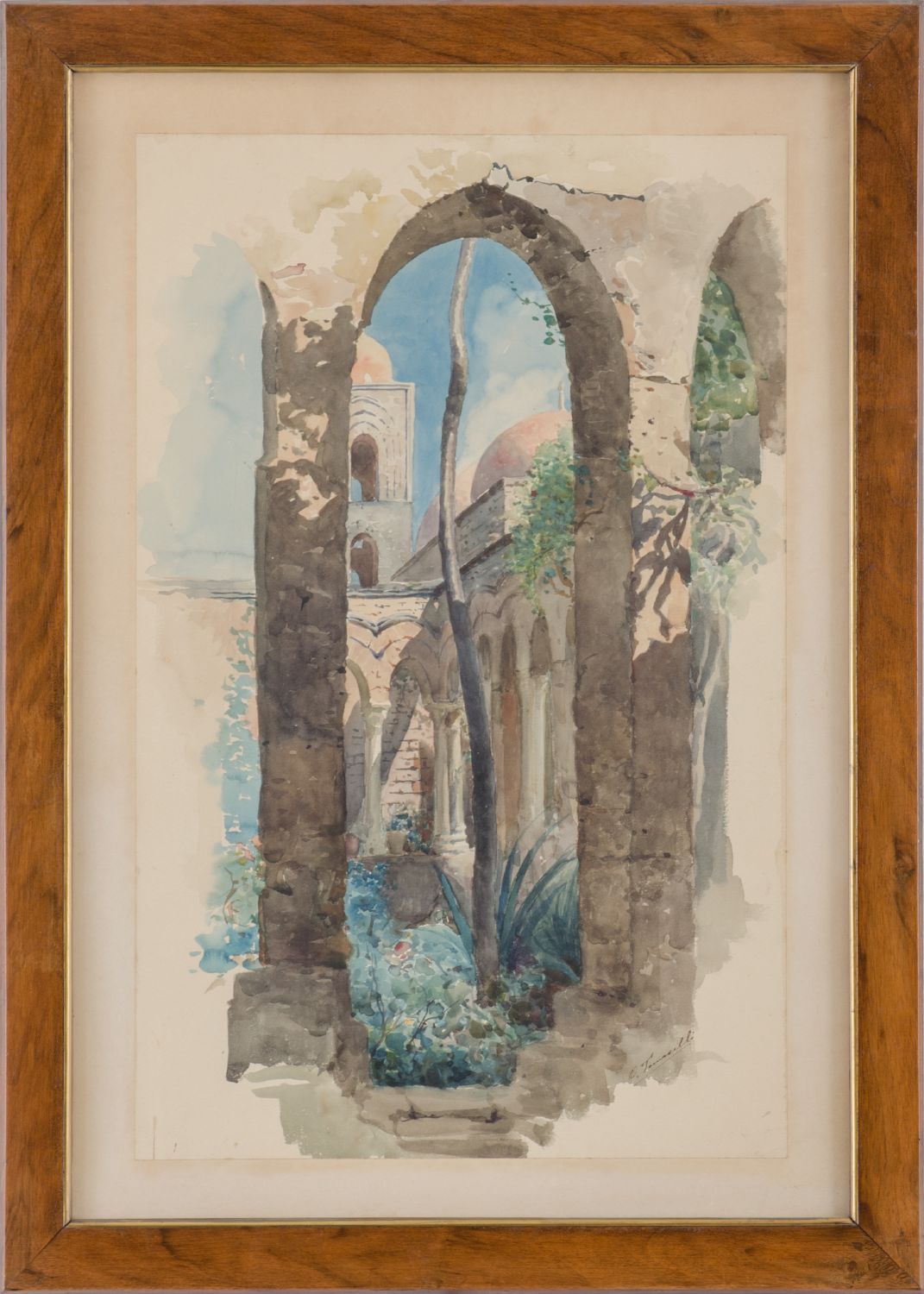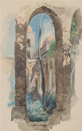 ONOFRIO TOMASELLI (Bagheria (Pa) - Palermo 1956) ACQUARELLO su carta "Chiostro di San Giovanni degli Eremiti", firmato a in basso a destra. Misure: cm 54,5 x 34,5