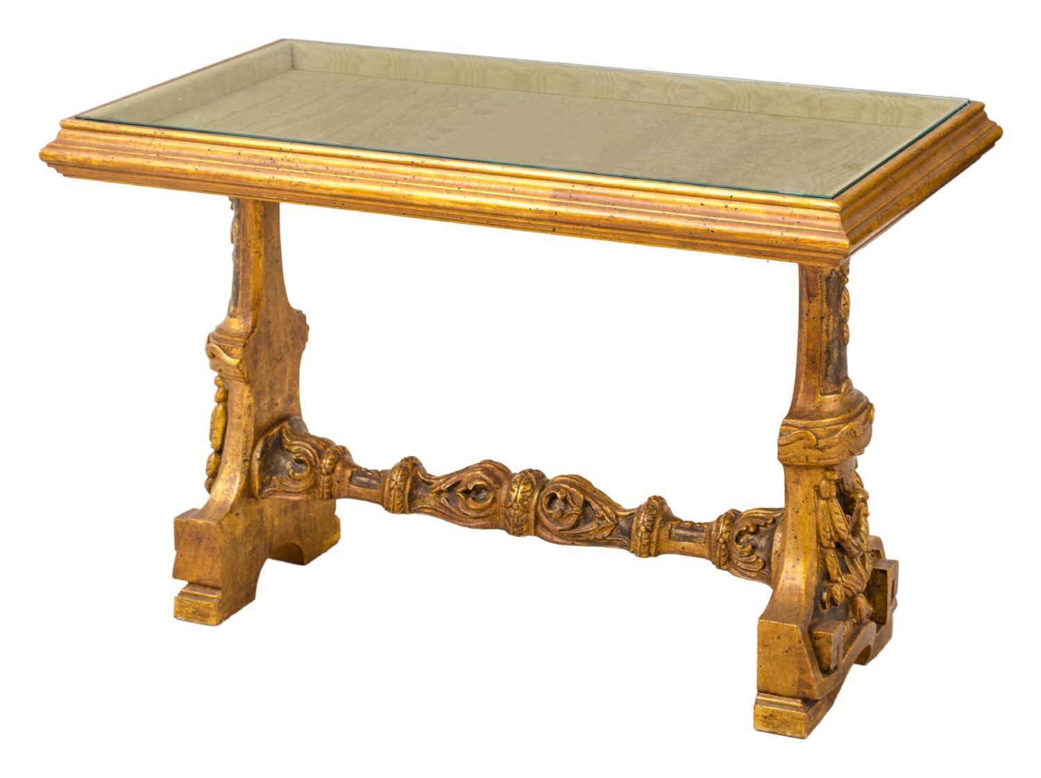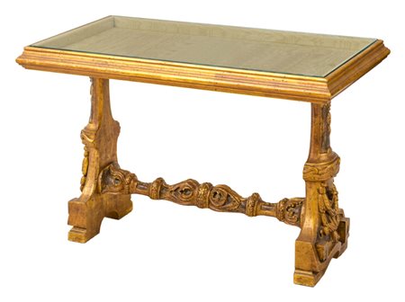 TAVOLINO/BACHECA in legno intagliato e dorato, piano in vetro. XIX secolo...