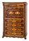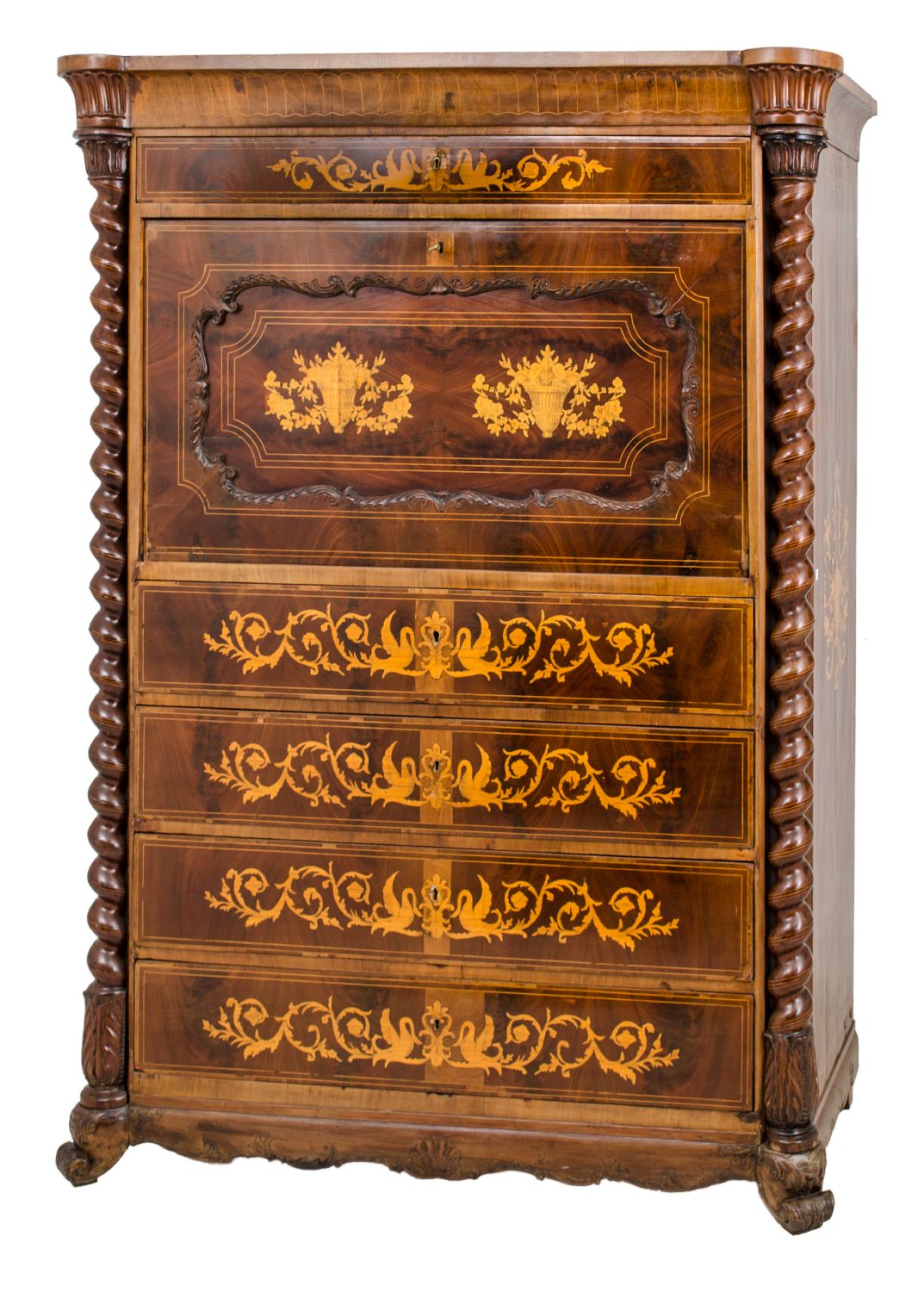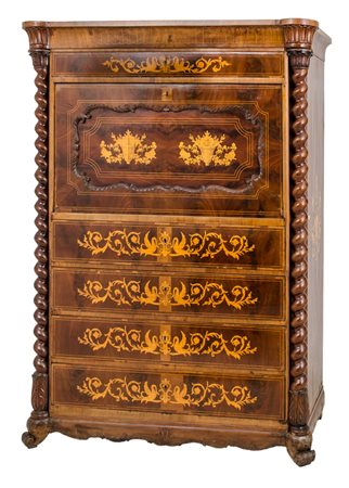 CHIFFONIERE Carlo X a quattro cassetti in mogano e piuma di mogano con tarsie in bosso. Sicilia I meta' '800 Misure: cm 135 x 60 x h 185