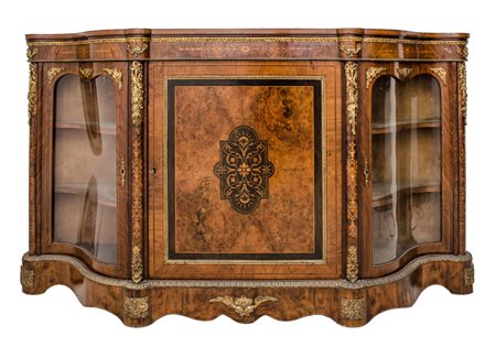 CREDENZA a tre ante con laterali bombati in radica di noce e legno ebanizzato, tarsie in bosso. Inghilterra XIX secolo Misure: cm 182 x 44 x h 106