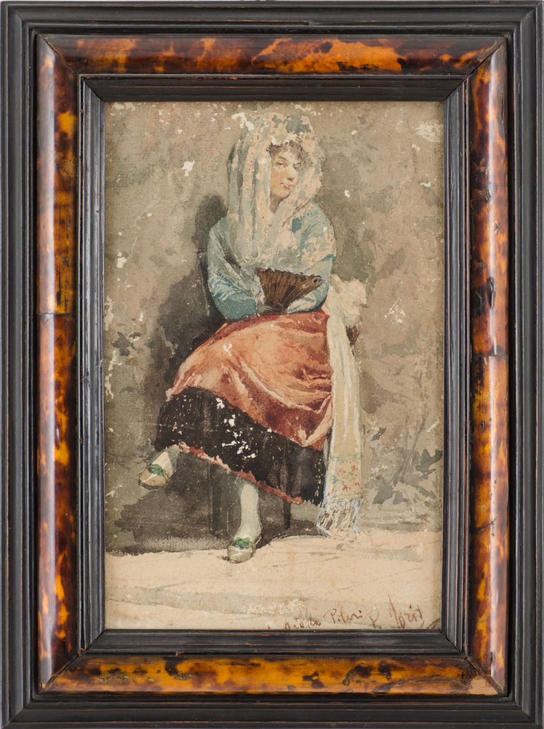 PIO JORIS (Roma 1843 - 1921) ACQUARELLO su carta "popolana" firmato in basso a destra entro cornice in legno ebanizzato con applicazioni in tartaruga (cm 31 x 23). Misure: cm 23,5 x 15,5