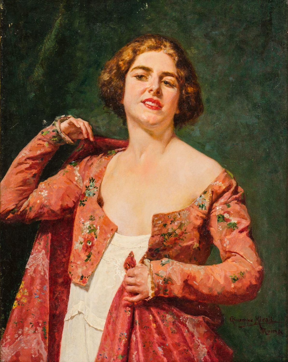 GIUSEPPE MICALI (Messina 1860 – Roma 1944) OLIO su tela "ritratto di donna (la piccola vanitosa)", firmato in basso a destra (pubblicato nel volume "Ottocento Siciliano" edito da Electa Napoli a pag. 148 - 149). Misure: cm 48,5 x 38