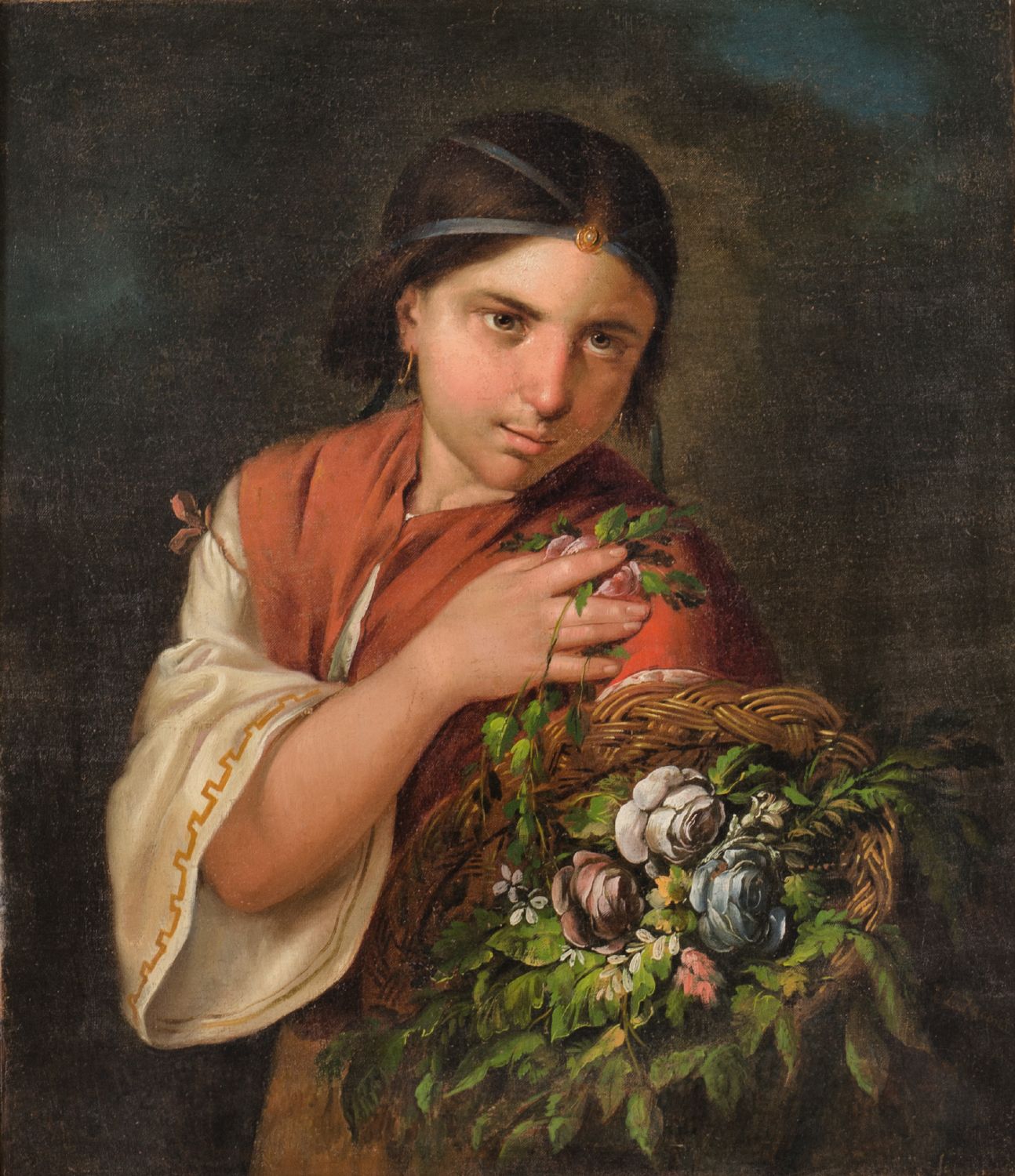 LUIGI LOJACONO (Palermo 1810 - 1880) OLIO su tela "fanciulla con cesto di fiori", firmato in basso a destra (pubblicato nel volume "Ottocento Siciliano" edito da Electa Napoli a pag. 141 - 142). Misure: cm 71 x 60