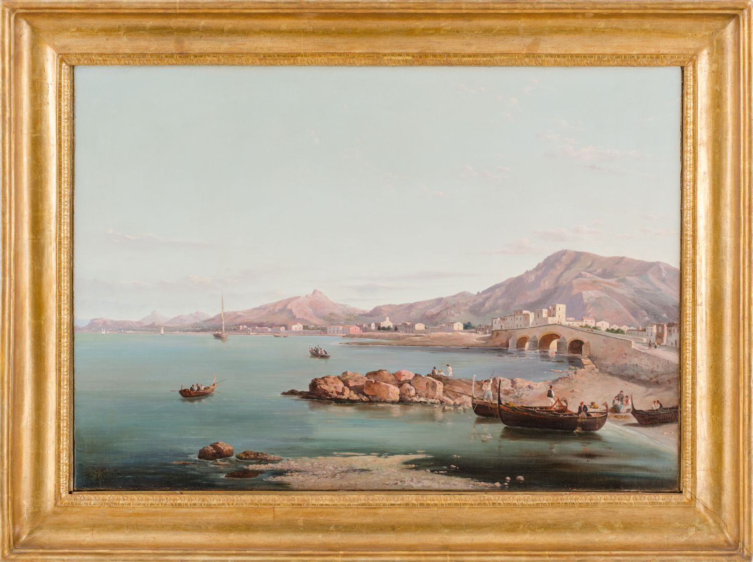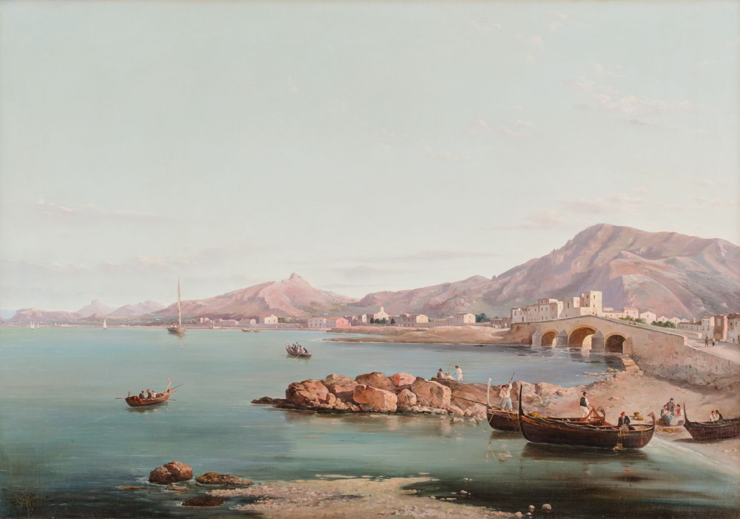 TOMMASO RIOLO (Palermo 1815 - 1886) OLIO su tela "veduta di Palermo (Ponte Ammiraglio), firmato e datato in basso a sinistra (pubblicato nel volume "Ottocento Siciliano" edito da Electa Napoli a pag. 166). Datato 1868 Misure: cm 69 x 98