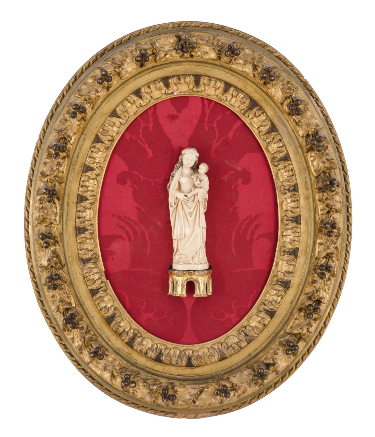 SCULTURA in avorio raffigurante "Madonna co Bambino" (cm 18 x 6) entro cornice in legno dorato. Spagna XIX secolo Misure: cm 59 x 49