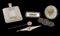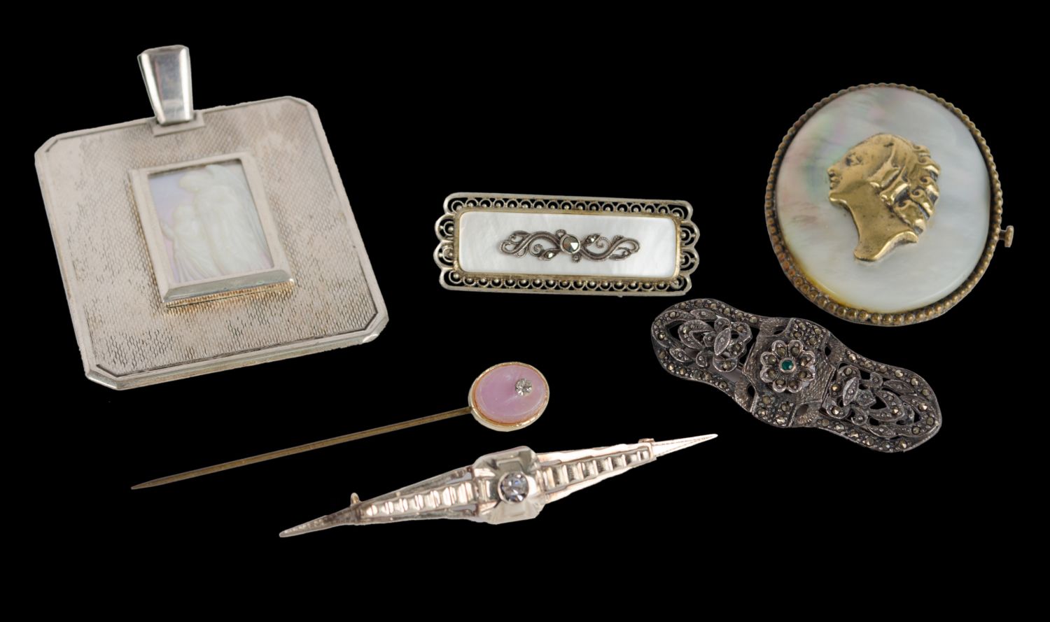 LOTTO composto da cinque SPILLE in argento ed oro basso titolo con inserti di pietre semiprezione e da PENDENTE in argento con bassorilievo in madreperla raffigurante "San Michele Arcangelo con Madonna". Sicilia primi '900