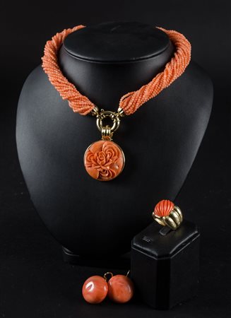 LOTTO composto da COLLANA, ANELLO e da ORECCHINI in oro giallo 18 Kt. e corallo.