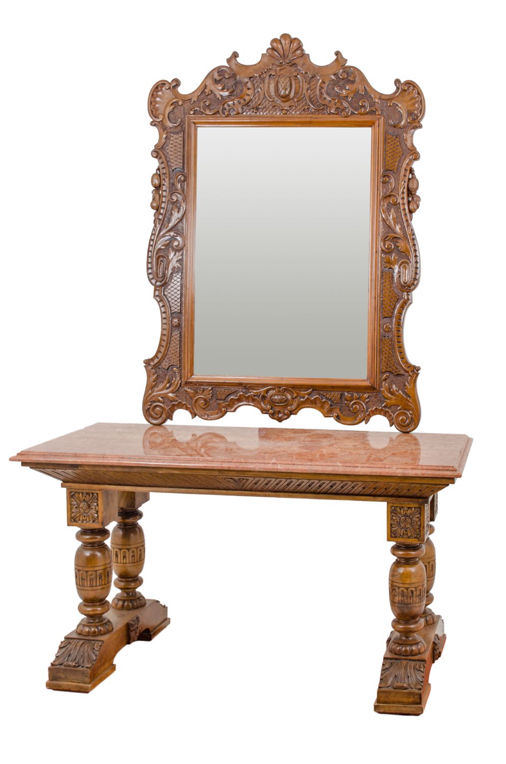 TAVOLO/CONSOLE stile Umbertino in noce riccamente intarsiato, con specchiera e piano in marmo rosso. Primi '900 Misure: cm 136 x 61 x h 210