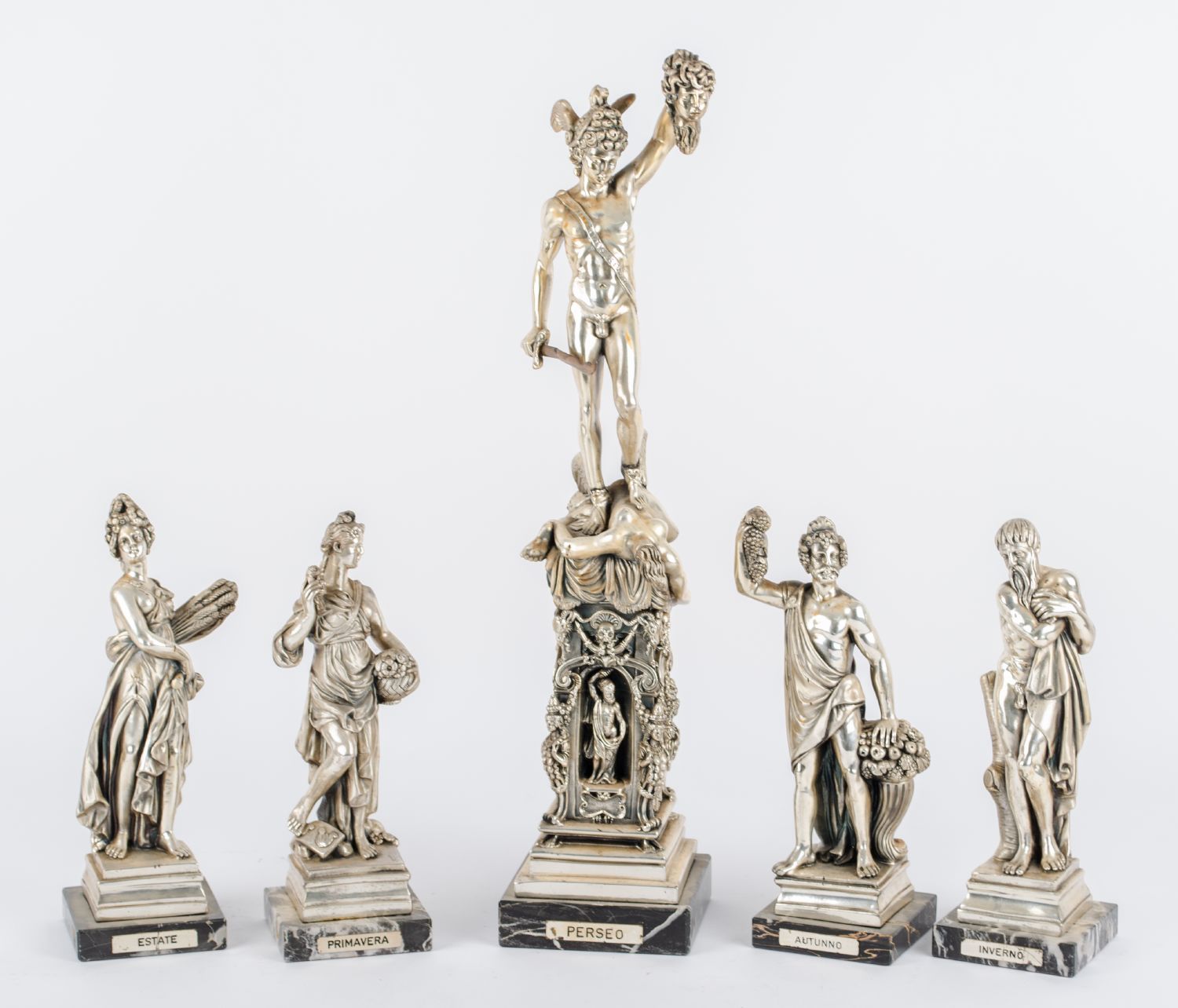 LOTTO composto da quattro SCULTURE in lamina d'argento raffiguranti "le 4 stagioni" e da SCULTURA in lamina d'argento raffigurante "Perseo" con base in marmo venato. Italia XX secolo Misure: varie