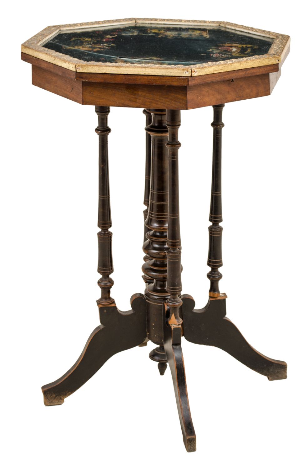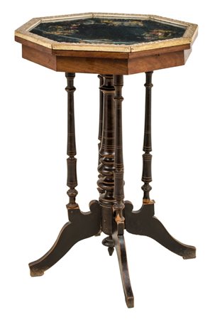 TAVOLINO ottagonale in noce con bordi in pastiglia, piano in stoffa ricamata raffigurante "scena di vita orientale". Sicilia fine '800 Misure: cm 52 x 52 xh 76