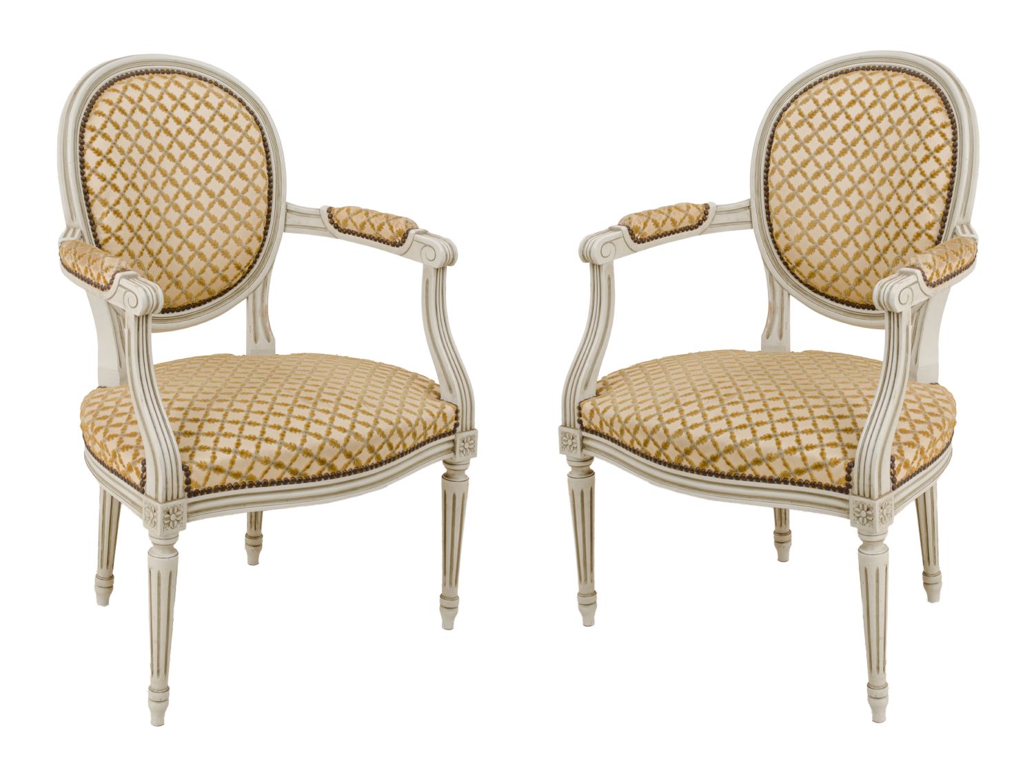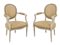 COPPIA POLTRONE stile Luigi XVI in legno laccato con tappezzeria nei toni dell'avorio. Francia primi '900 Misure: cm 59 x 49 x h 89