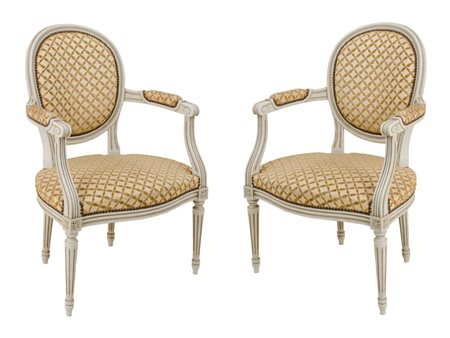 COPPIA POLTRONE stile Luigi XVI in legno laccato con tappezzeria nei toni...