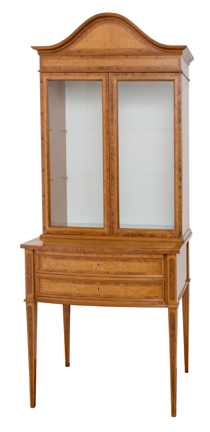 MOBILE doppio corpo con vetrina in noce, radica di noce, tuja ed acero con due cassetti. Italia XX secolo Misure: cm 66 x 52 x h 187