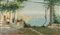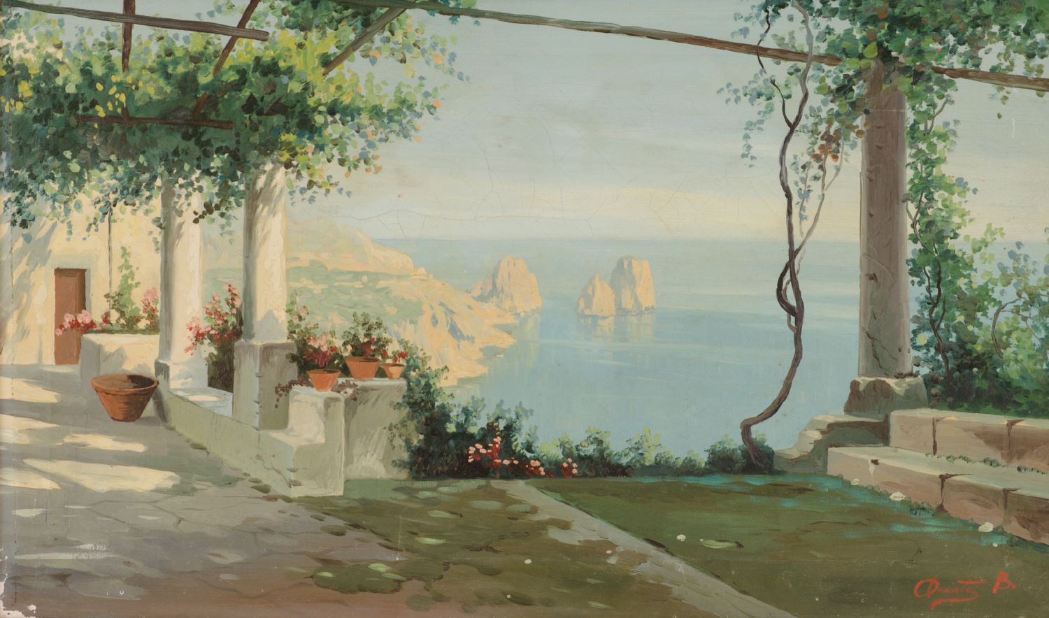 OLIO su tela "esterno di villa con veduta dei faraglioni di Capri". Primi...