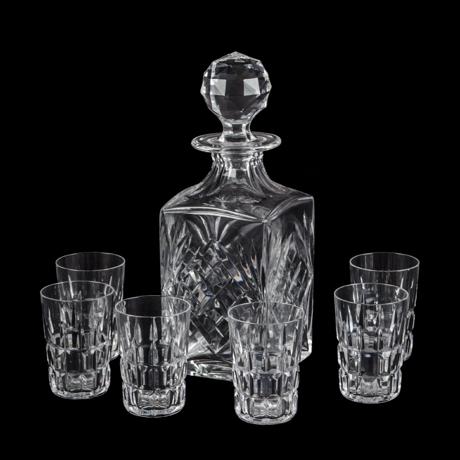 SERVIZIO in cristallo Saint Louis composto da BOTTIGLIA e da sei BICCHIERI da liquore. XX secolo Misure: varie