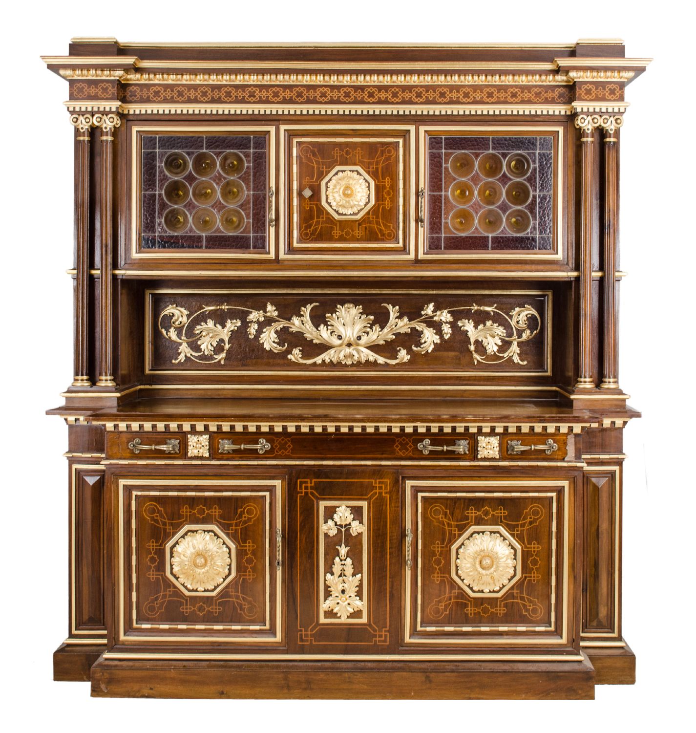 CREDENZA doppio corpo di gusto rinascimentale in noce con tarsie in bosso e bordure in legno dorato. Italia fine '800 Misure: cm 223 x 67 x h 237