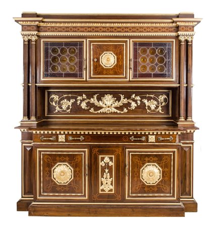CREDENZA doppio corpo di gusto rinascimentale in noce con tarsie in bosso e...