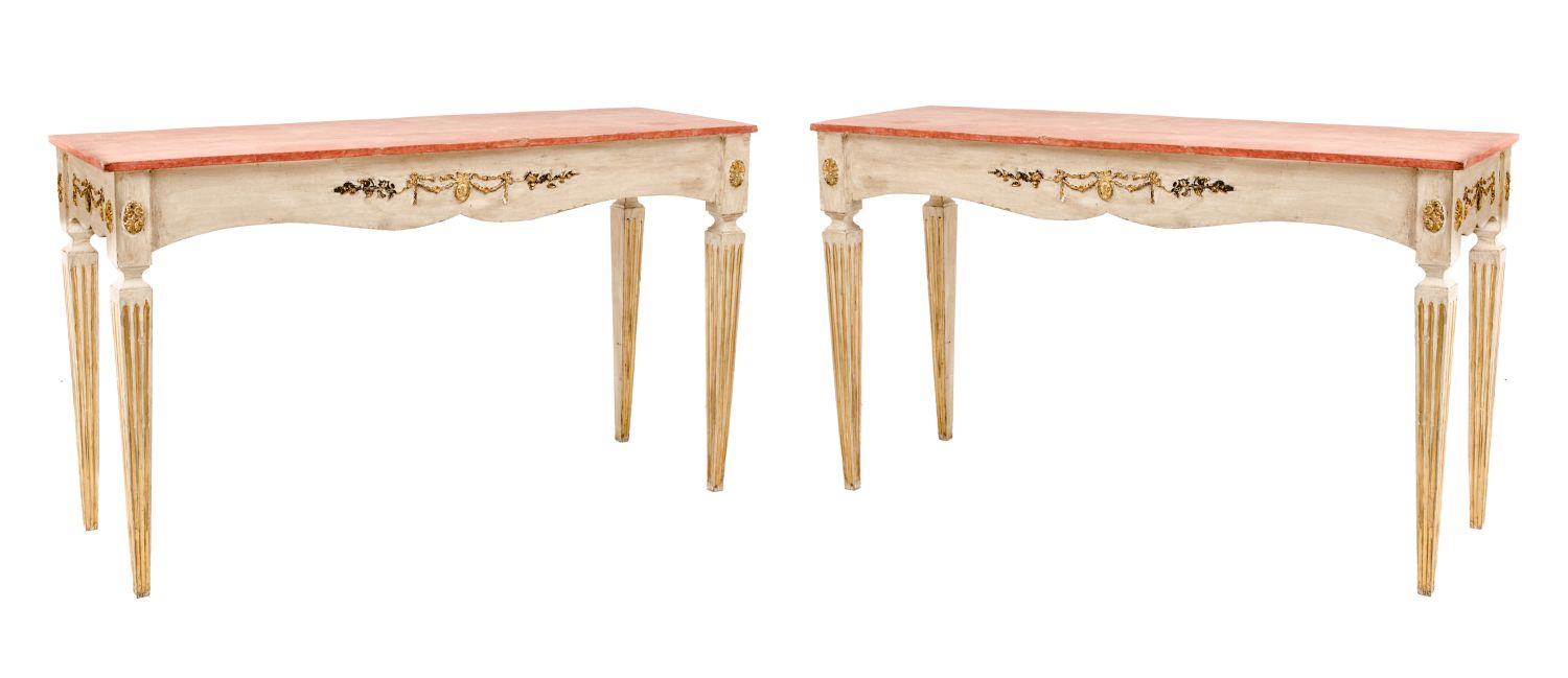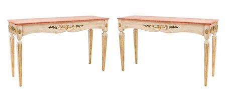 COPPIA CONSOLE stile Luigi XVI in legno laccato e dorato. Italia XX secolo...