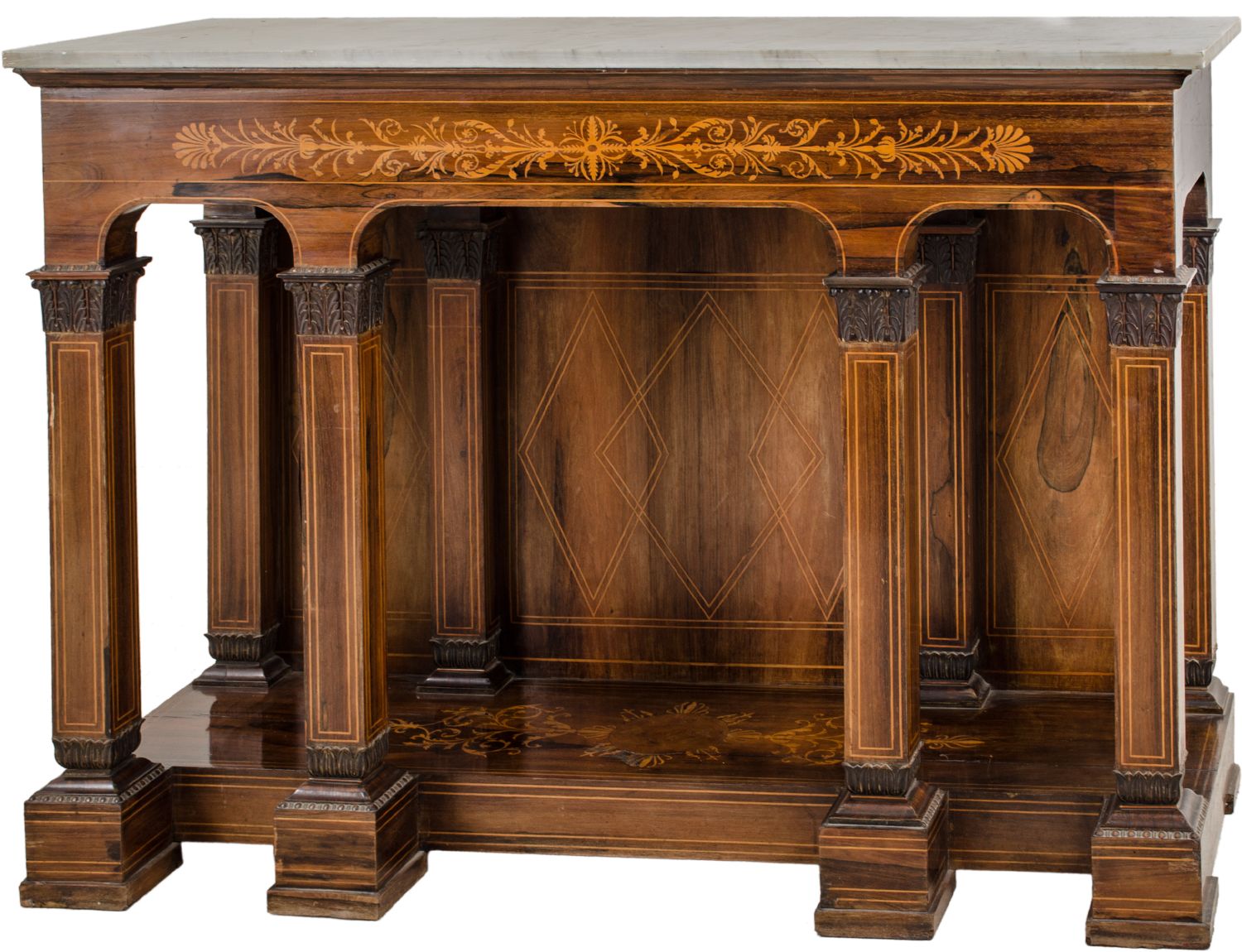 CONSOLE Carlo X in palissandro con tarsie in bosso, piano in marmo bianco di...