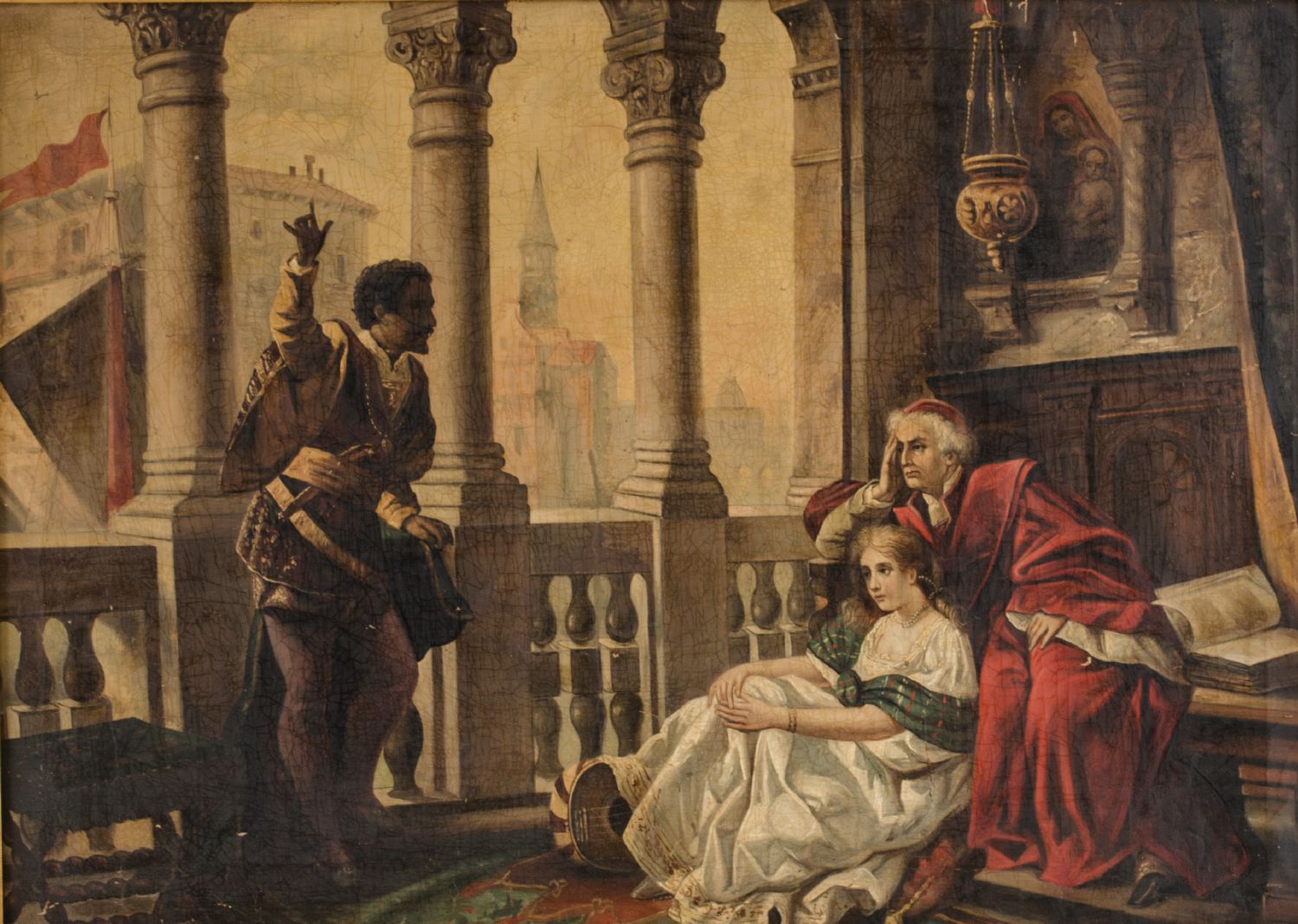 OLIO su tela "scena d'interno con cardinale e personaggi". Primi '900 Misure: cm 67 x 93