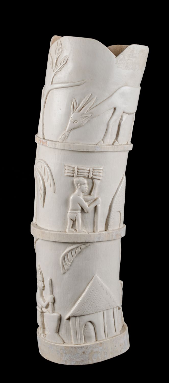 SEZIONE DI ZANNA in avorio intagliato raffigurante "vegetazione con animali". Africa primi '900 Misure: h cm 50