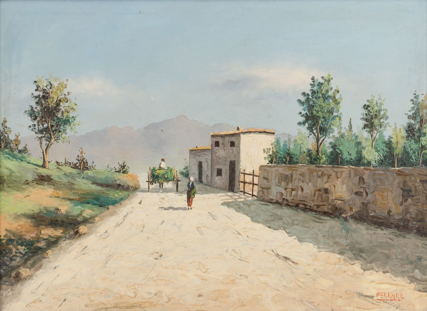 FERRARA OLIO su tela "paesaggio con trazzera" firmato in basso a destra. Sicilia primi '900 Misure: cm 53 x 73