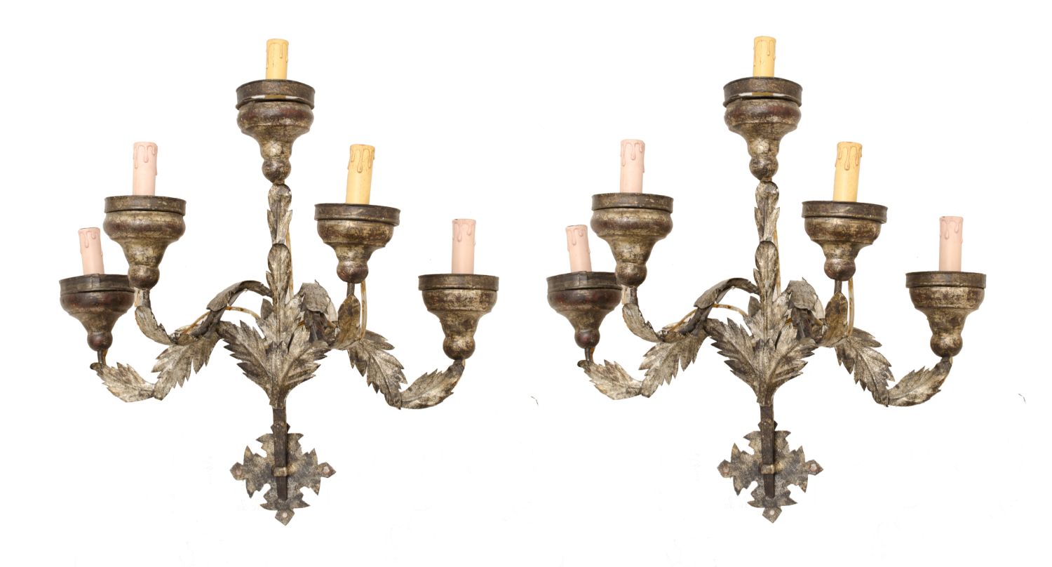 COPPIA APPLIQUES a cinque luci in ferro e legno argentato. Italia XVIII secolo Misure: h cm 55