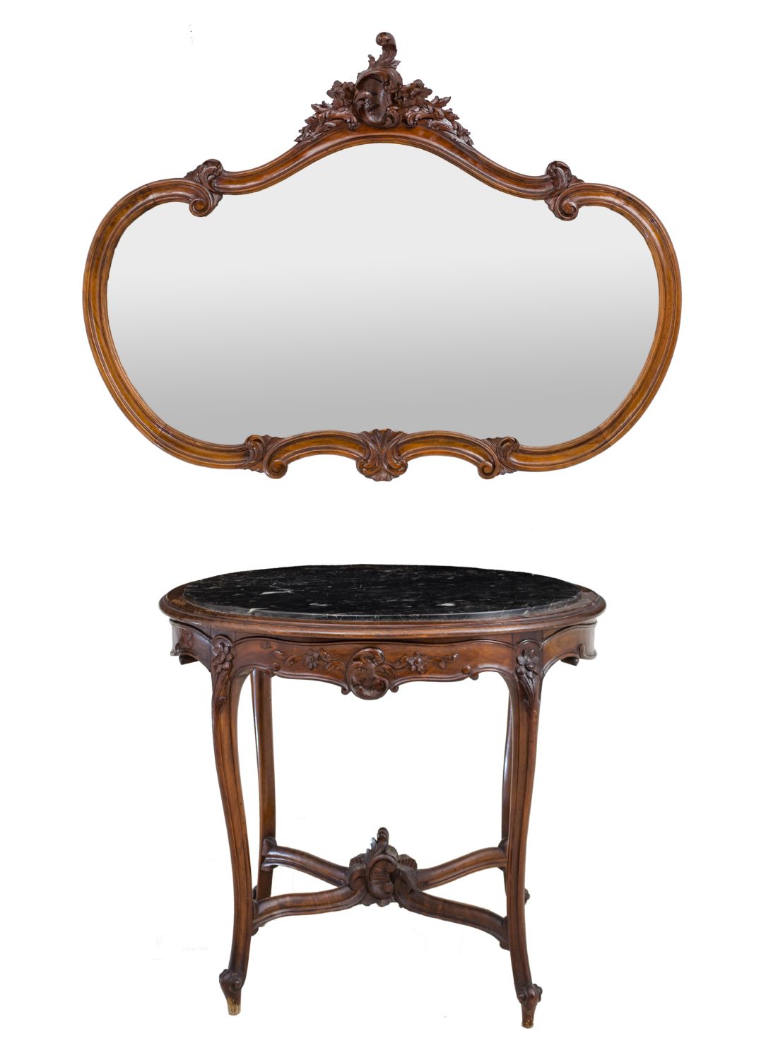 TAVOLINO da salotto in faggio con piano in marmo nero incassato e SPECCHIERA sagomata in noce con cimasa intagliata. XX secolo Misure: varie