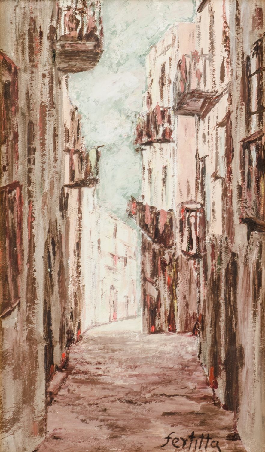 CARMELO FERTITTA (Gioiosa Marea (Me) 1911 - Palermo 1995) OLIO su tela "vicolo". Misure: cm 50 x 30