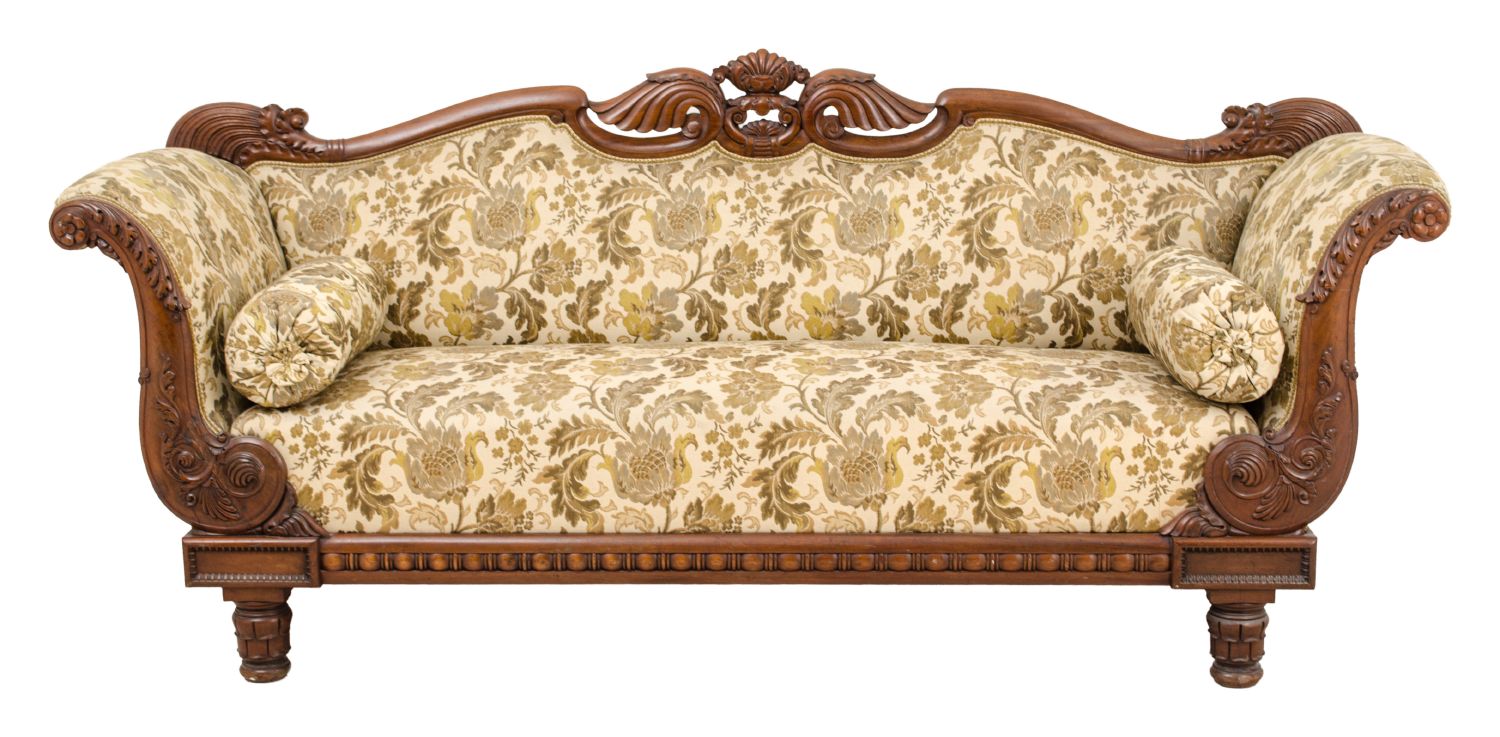 DIVANO Luigi Filippo in noce scolpito con tappezzeria a motivo floreale....