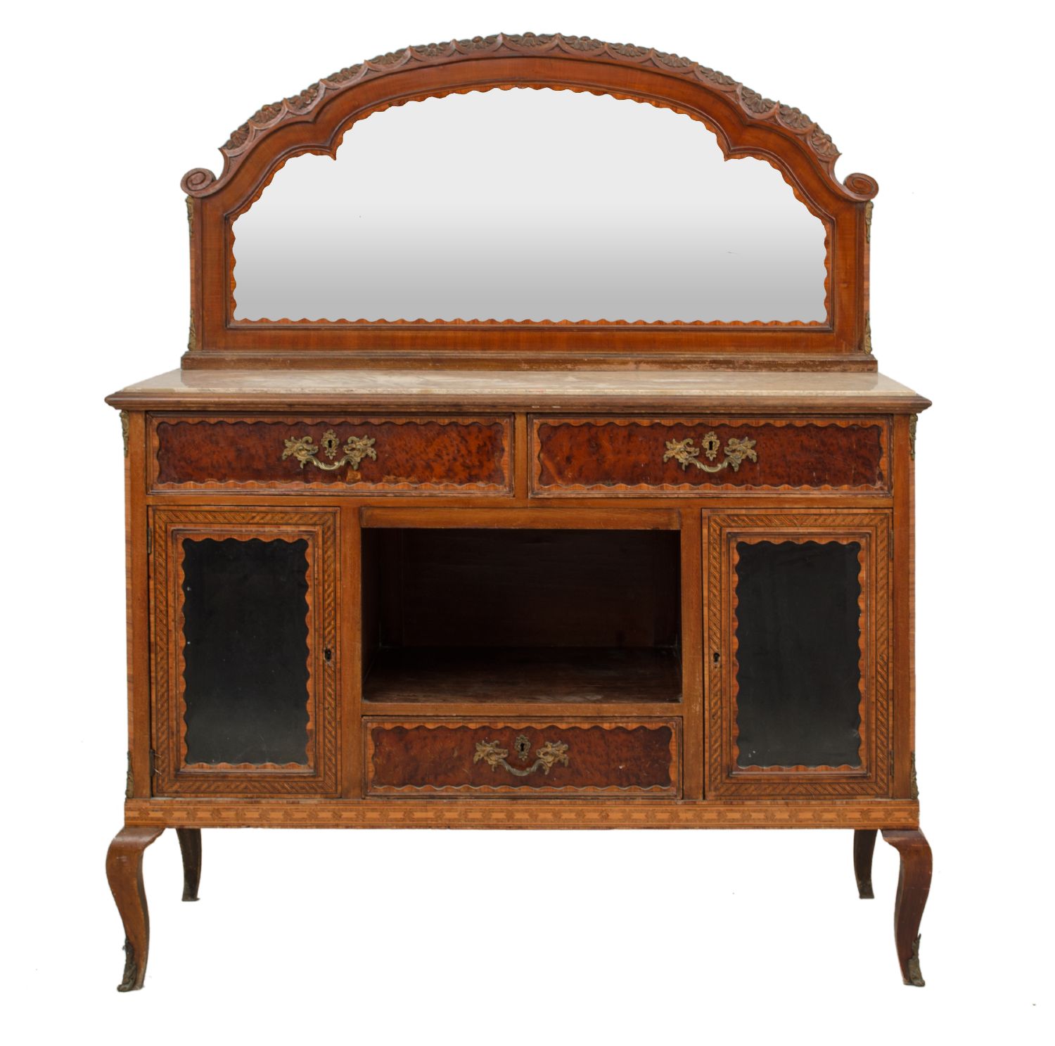 CREDENZA CON SPECCHIERA a due ante e due cassetti in mogano, noce e radica di tuja con tarsie in bosso a disegno geometrico. Sicilia primi '900 Misure: cm 137 x 53 x h 164
