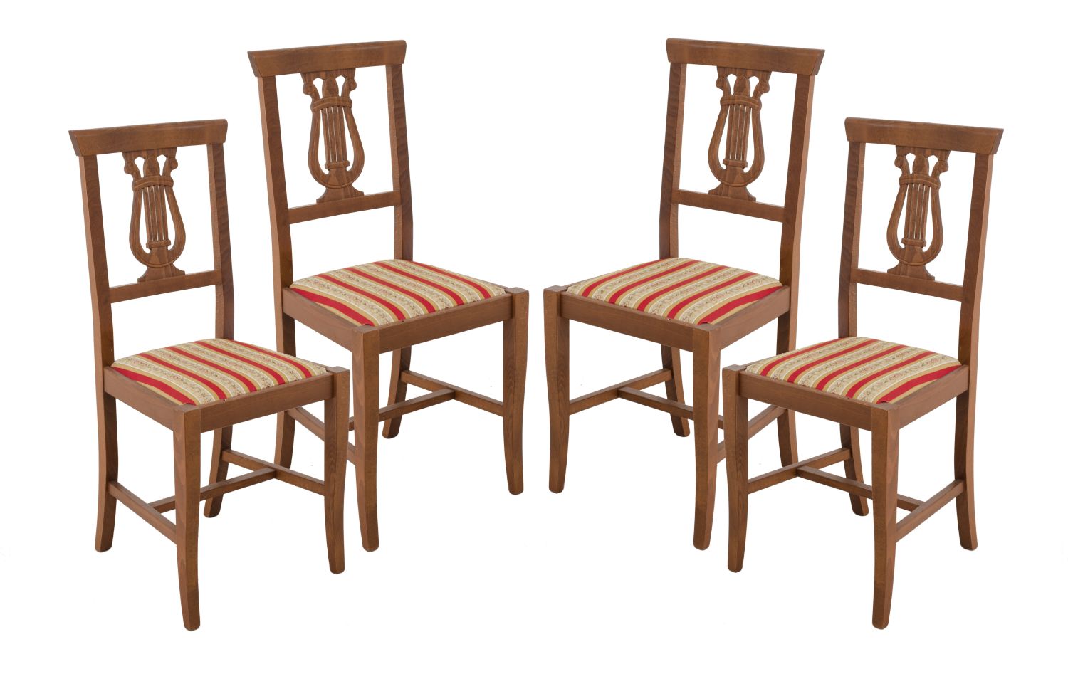 QUATTRO SEDIE in faggio con spalliera a lira (seduta h cm 46). XX secolo Misure: h cm 93