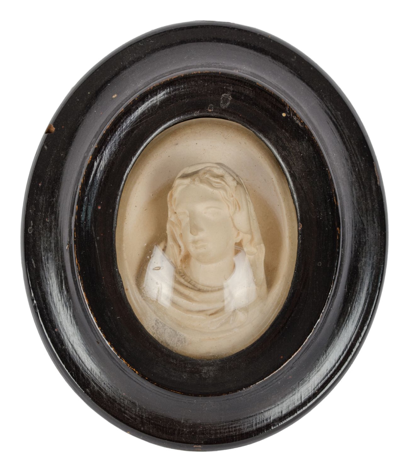 SCULTURA in schiuma raffigurante "Madonna" entro piccola teca ovale in legno. Sicilia XX secolo Misure: cm 10 x 12