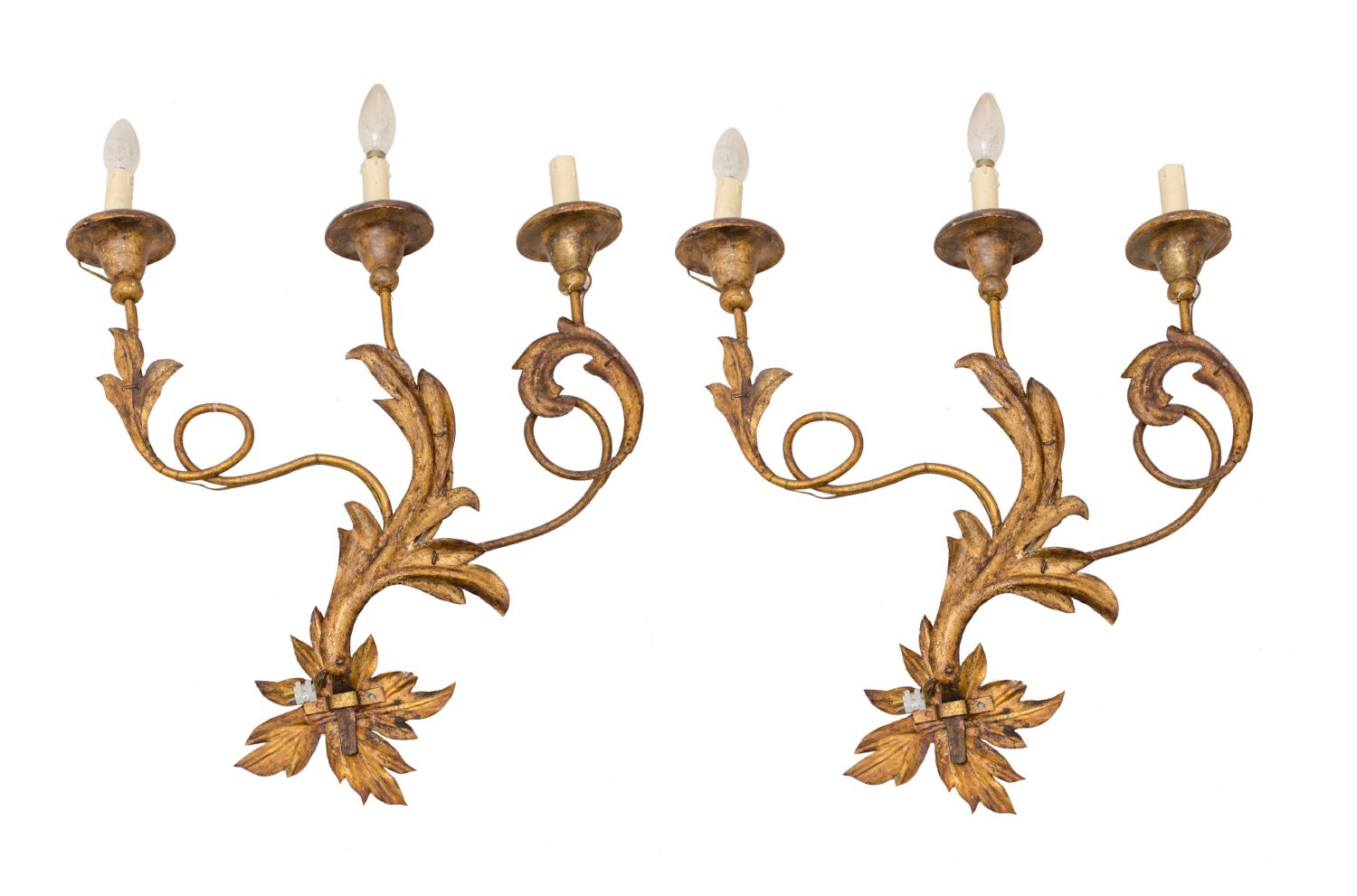 COPPIA APPLIQUES a tre luci in ferro dorato e legno. Toscana meta' '900...
