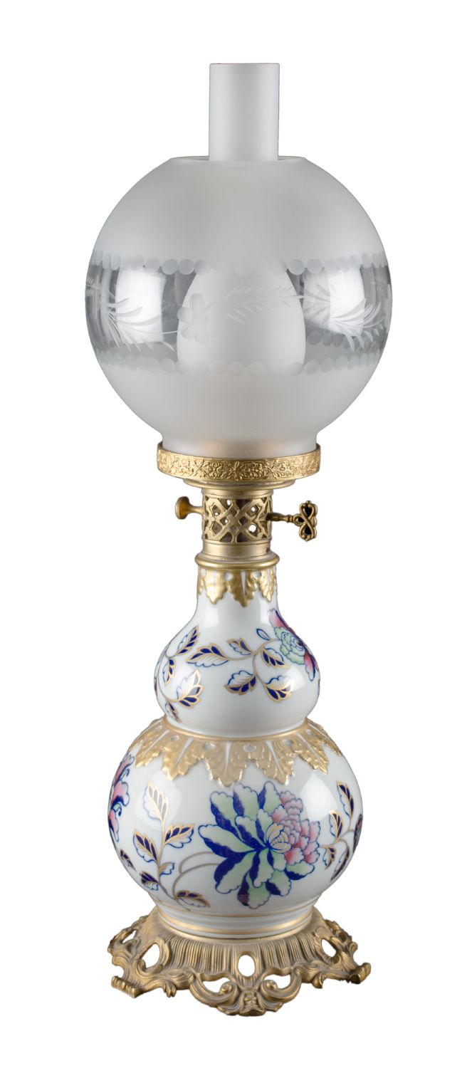 LUME in porcellana bianca decorata con base in bronzo e braccia in vetro. Francia XX secolo Misure: h cm 60