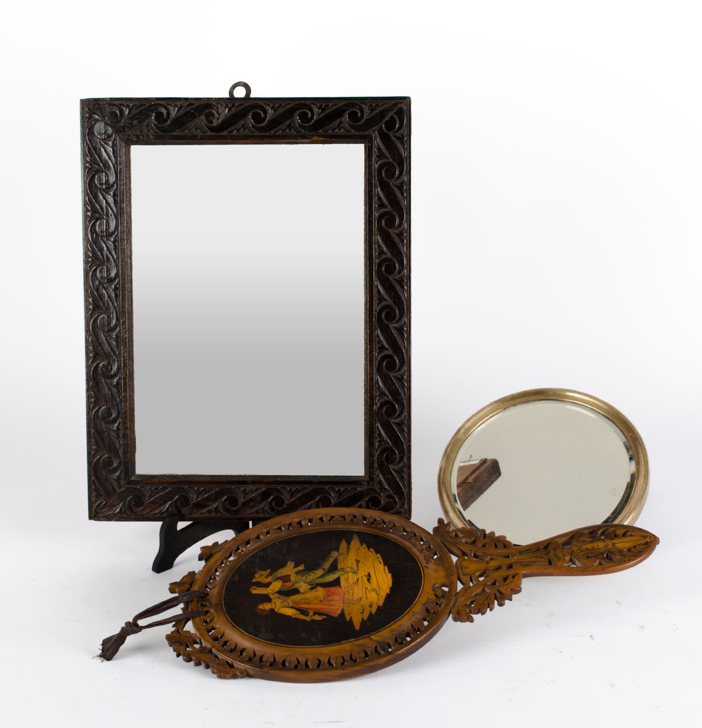 LOTTO composto da SPECCHIO da tavola in legno traforato e dipinto, SPECCHIO da tavola in metallo argentato e da SPECCHIERA in legno. XX secolo Misure: varie